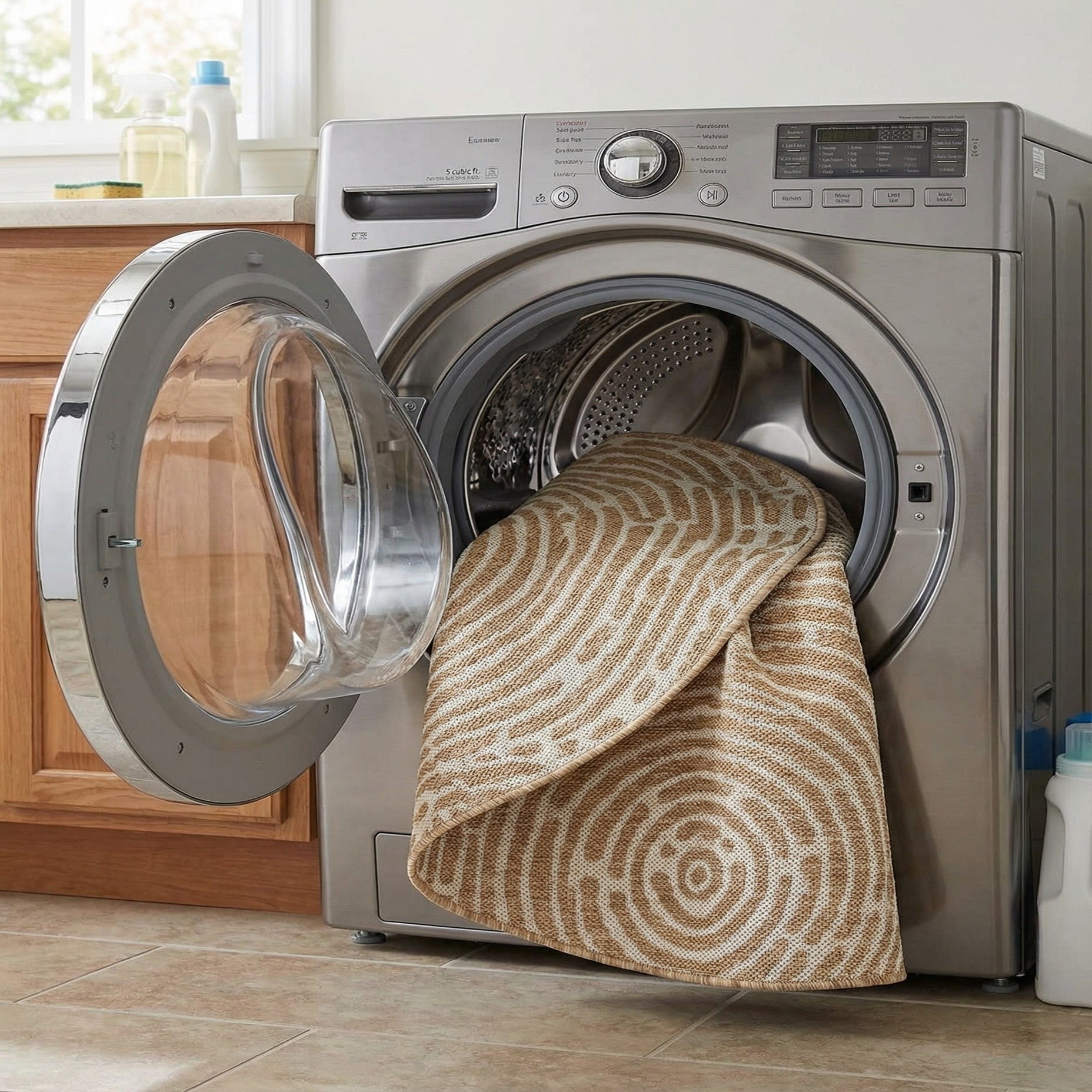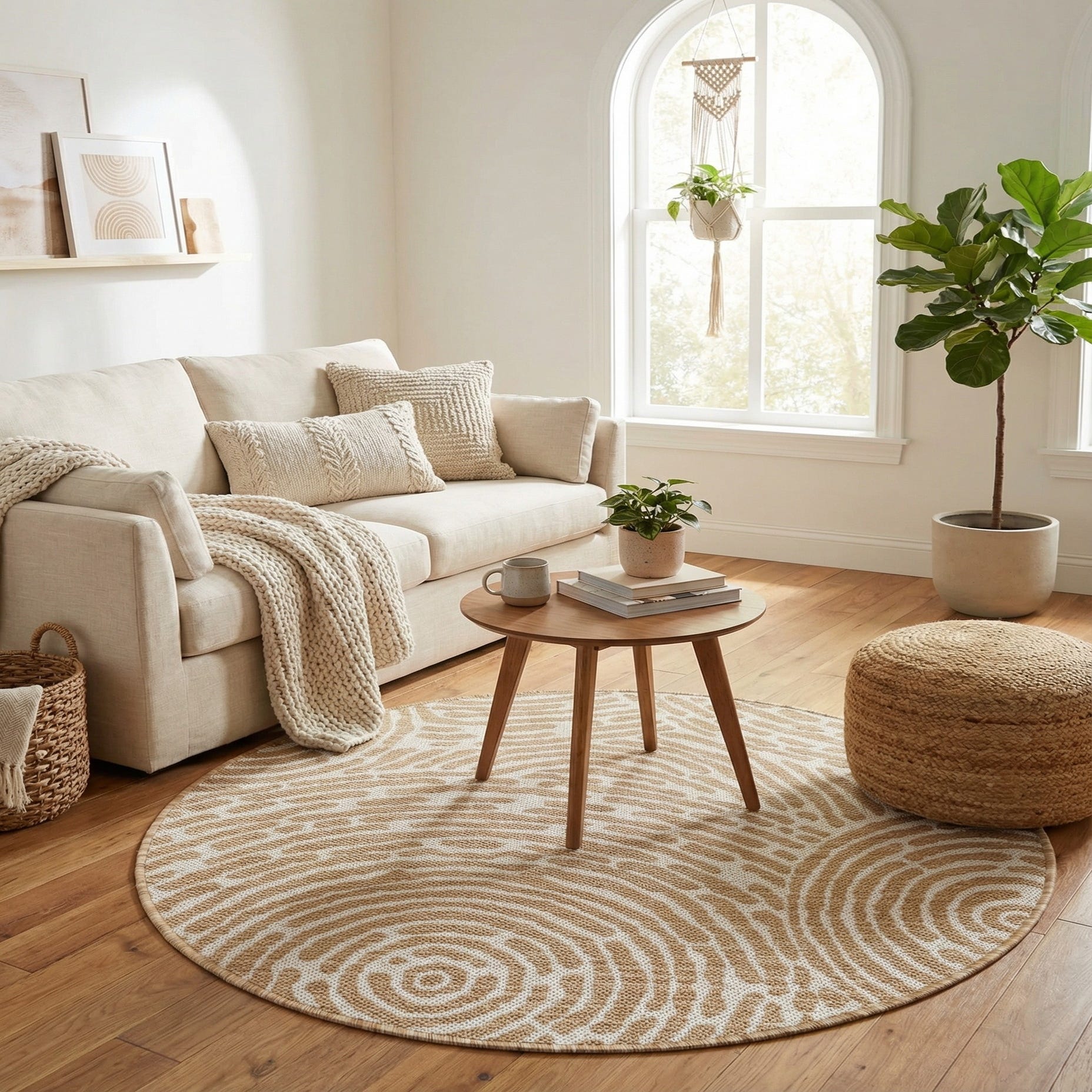 The neutral taupe and ivory palette works easily with light woods, rattan, and matte metal accents — ideal for a sunroom, covered patio, or an entry vignette where a round shape defines a seating or dining nook. Use it under a bistro set, beside a bed layered with a larger rug, or to soften modern outdoor furniture; it pairs well with coastal, Scandinavian, or modern casual interiors that favor warm neutrals and natural materials.