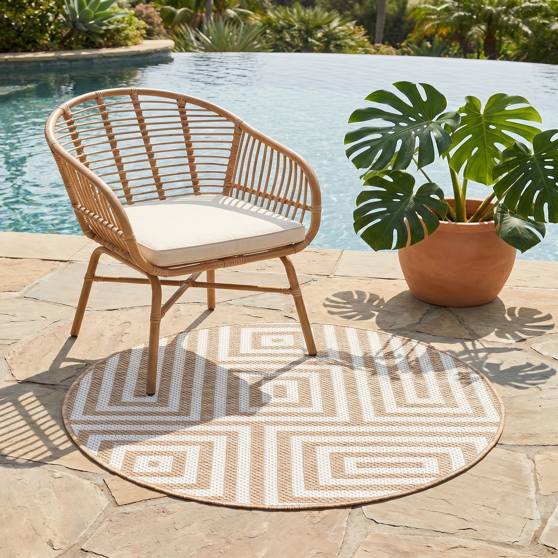 Love the contemporary look of this rug! We are so happy we chose this to accent the blue of our pool with our living area on our lanai. We still are going to add a few more pillows but love the rug to add color.