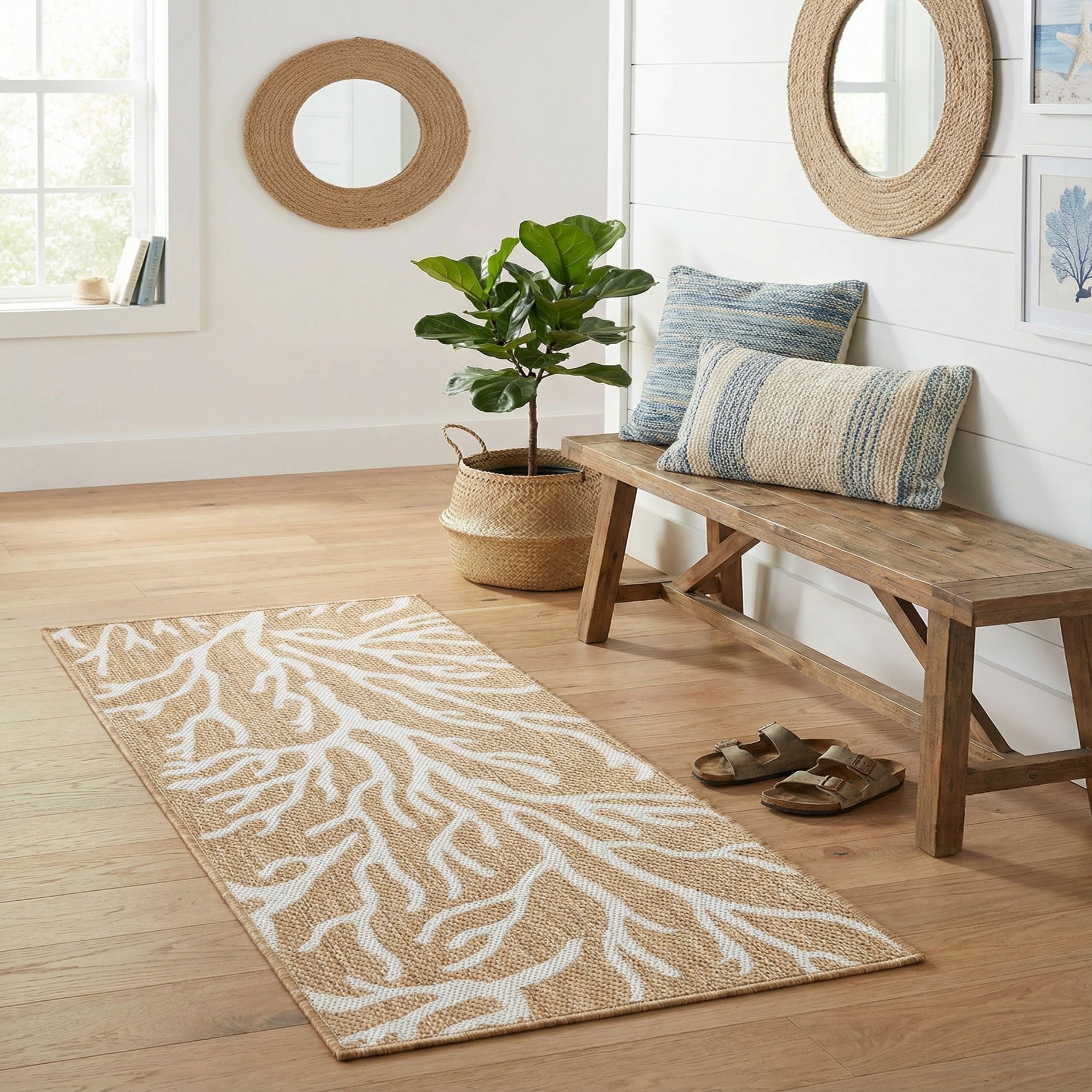 A 4 ft runner rug featuring a modern coastal coral pattern in brown and ivory tones, suitable for hallways or patios.