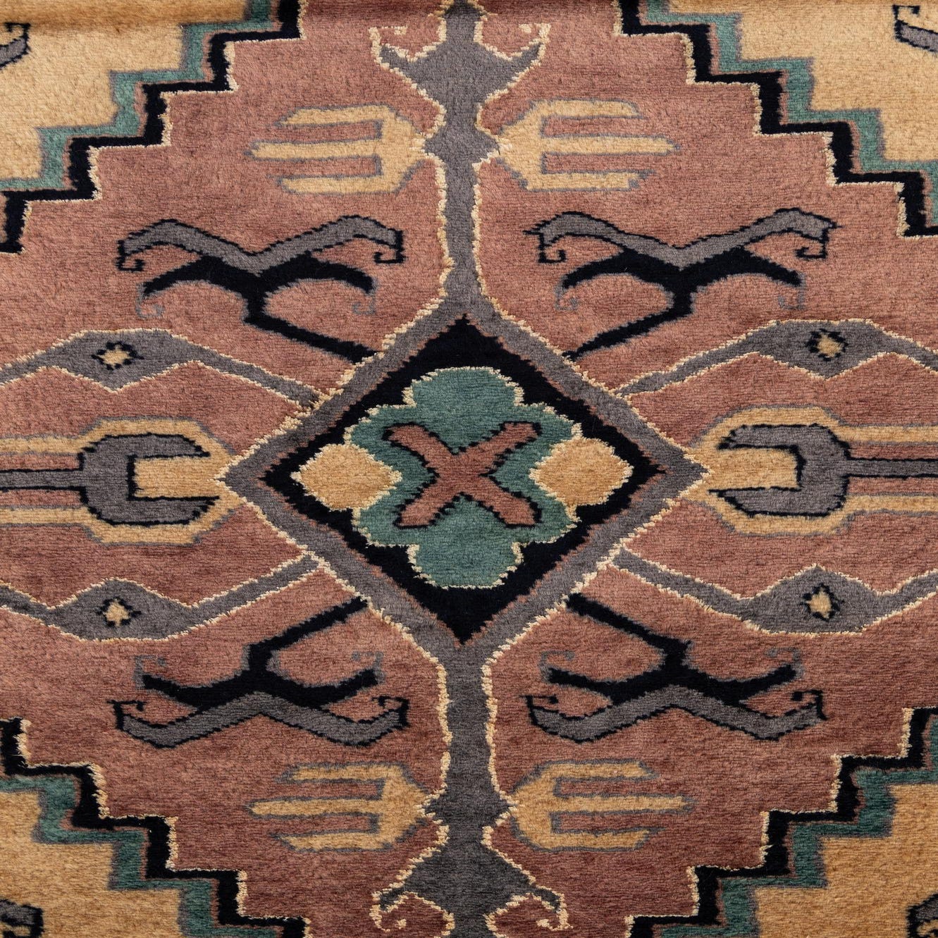 This piece works well to ground a living area beneath a coffee table, to add pattern and warmth in an entry or study, or layered over hardwood for added texture. Pair it with warm wood tones and leather seating for a classic look, with neutral upholstery and muted jewel-tone accents to echo the green and violet, or use it to balance a mid-century or transitional scheme that needs a calm, patterned anchor.