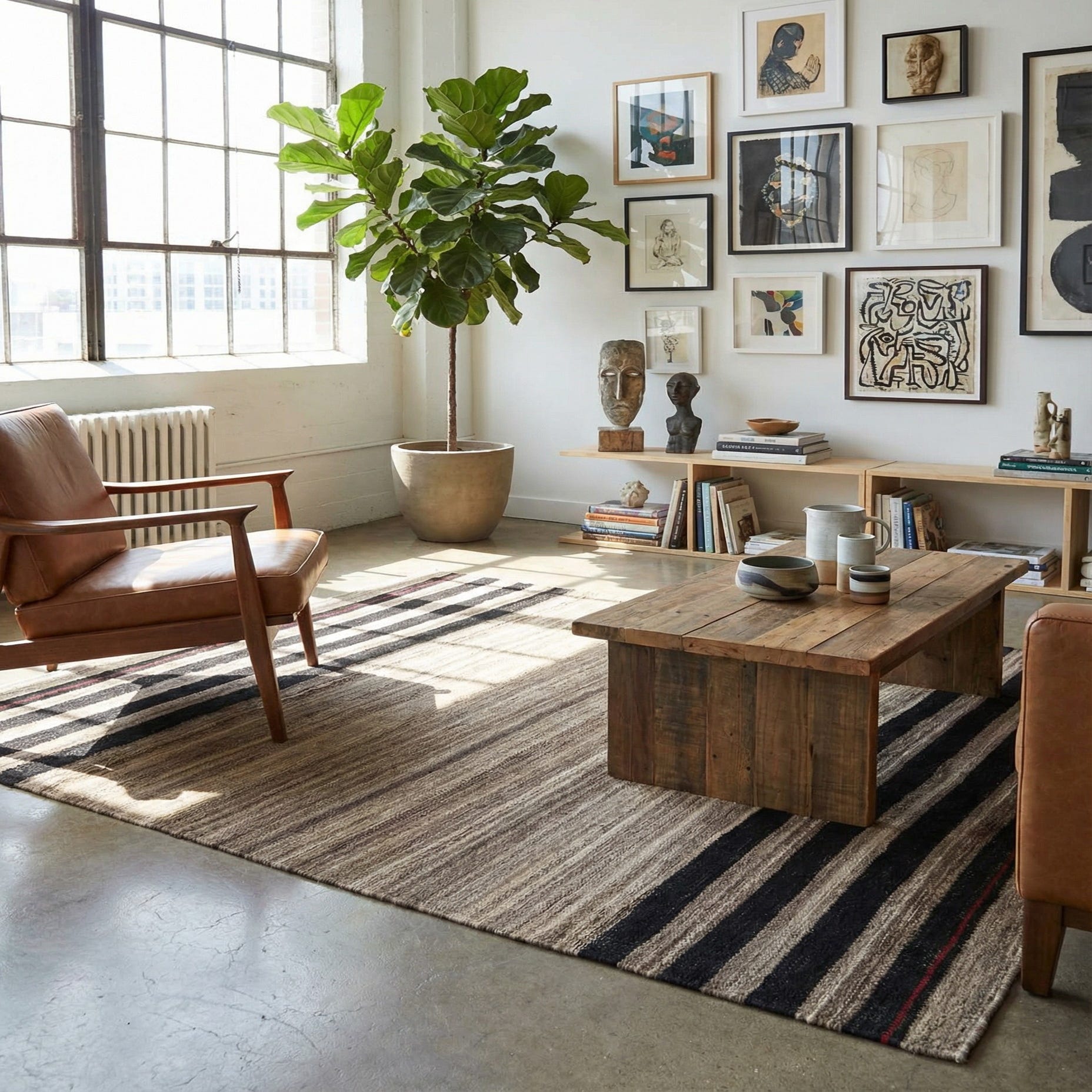 Due to its versatile color palette and sophisticated design, this rug would work well in various interior design scenarios: it can anchor a casual living space, add an organic touch to a sleek, modern office, or complement the understated elegance of a minimalist bedroom. The Kilim Modern rug provides an effortless match for furniture in natural wood tones or metallic finishes and is a suitable foundation for a room with a mix of eclectic elements.