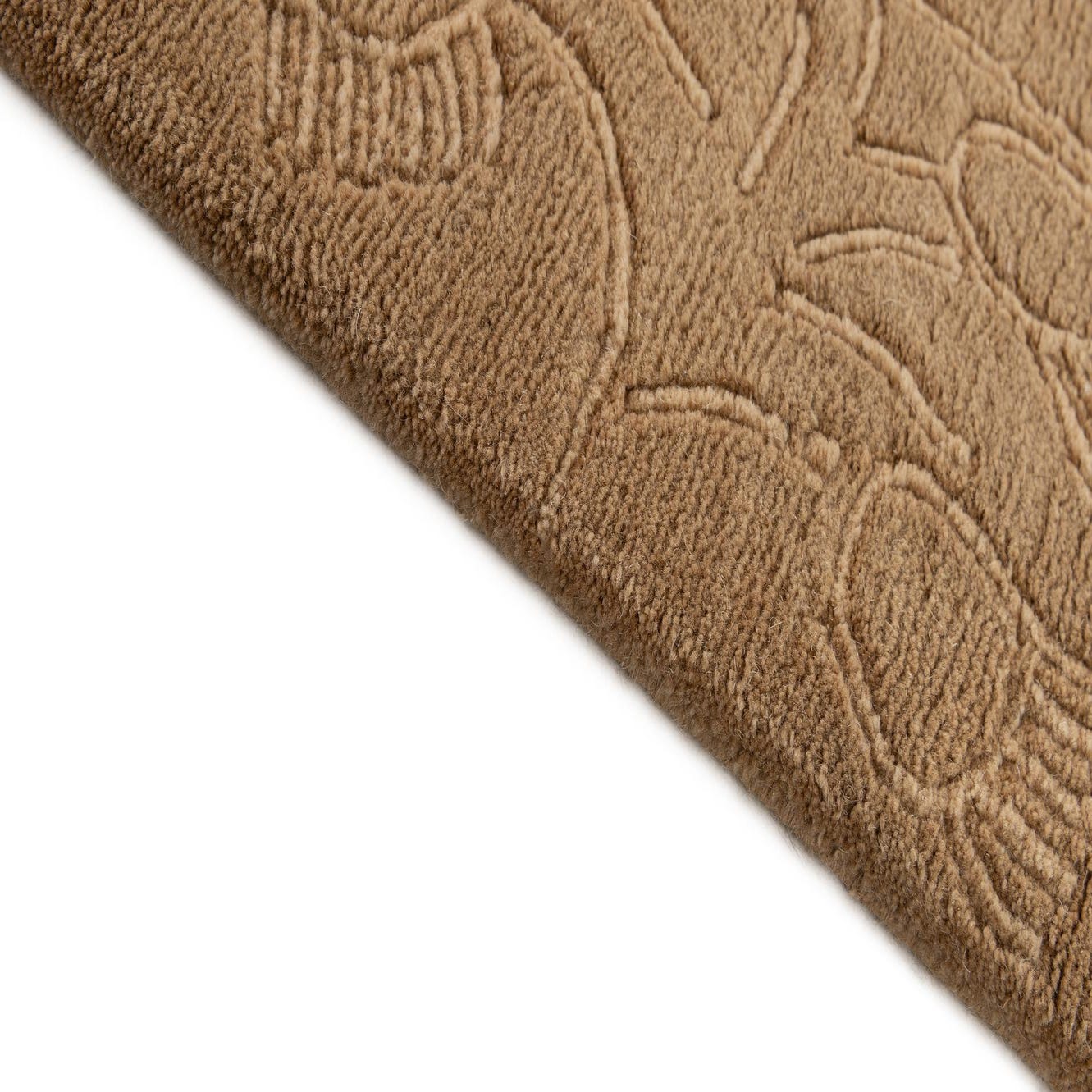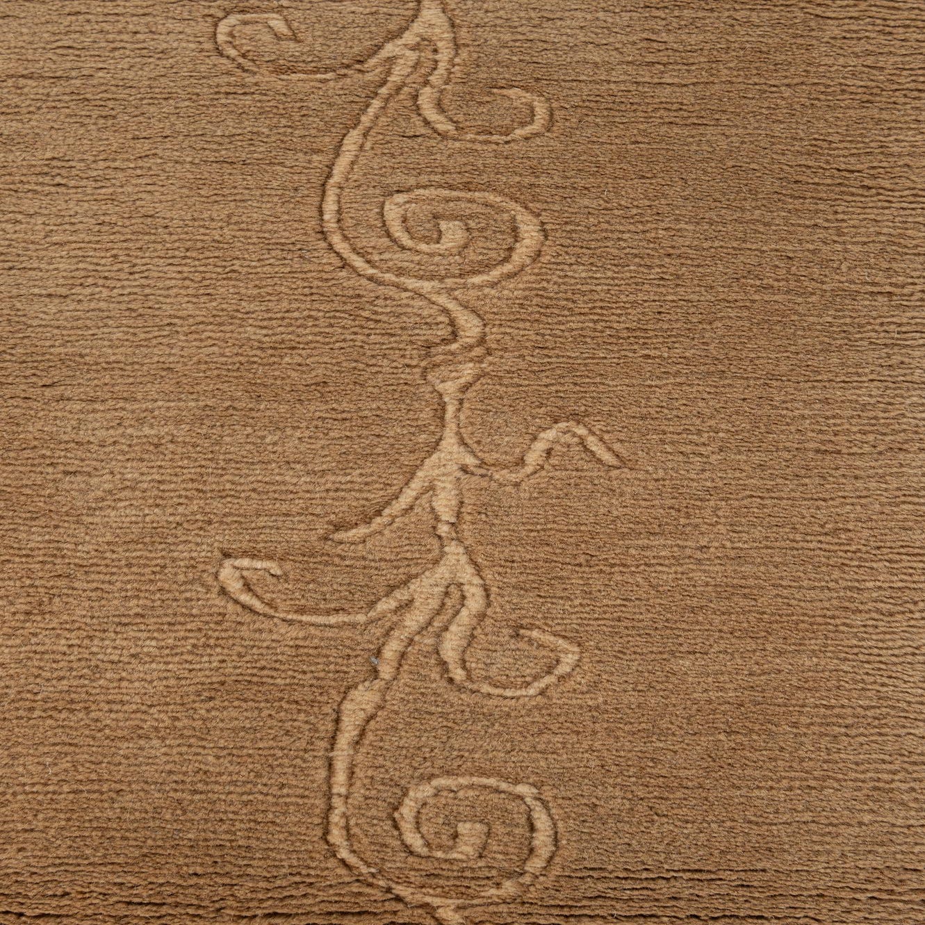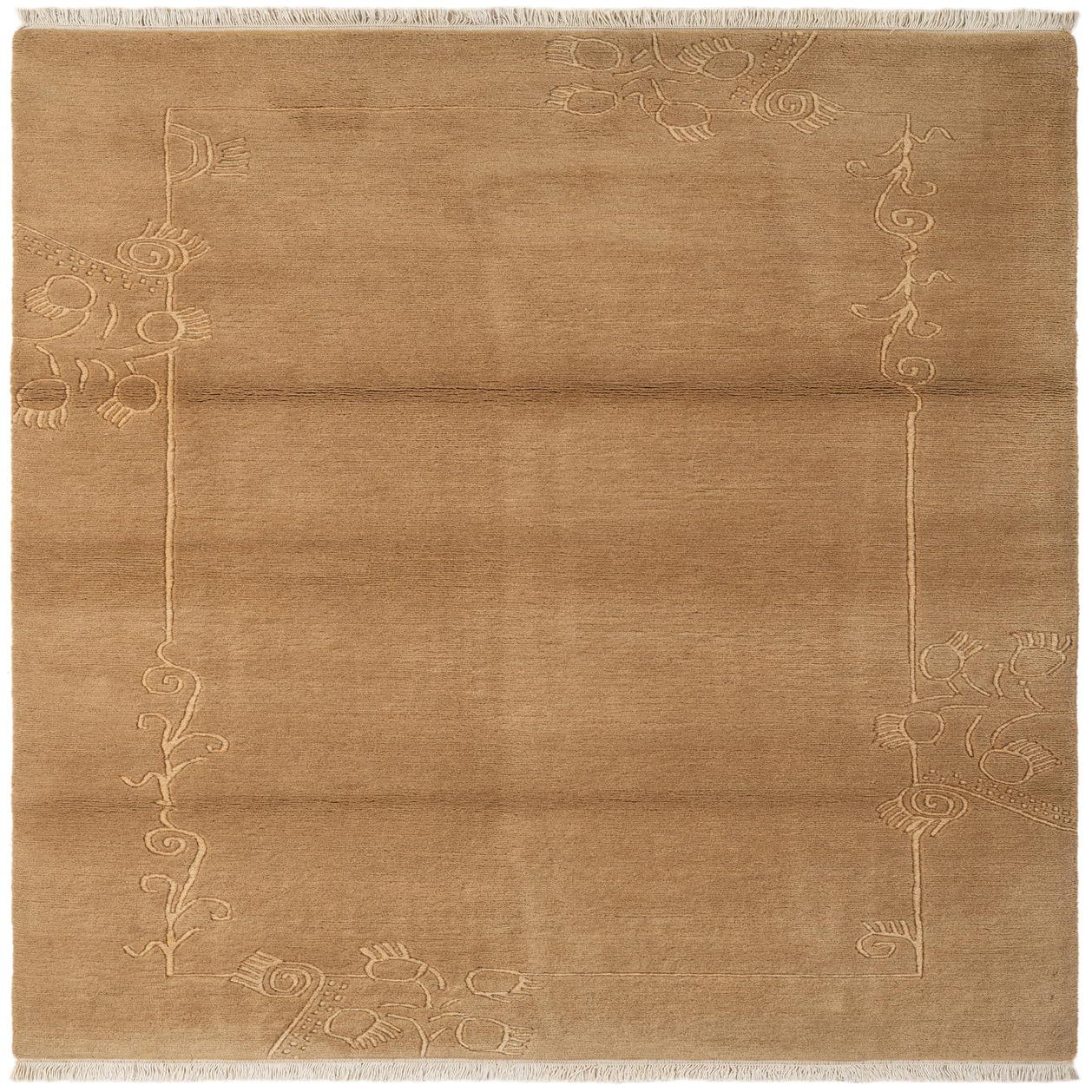 A 4x6 rectangular brown wool rug with a subtle raised ivory abstract floral and vine border, featuring short white fringe.