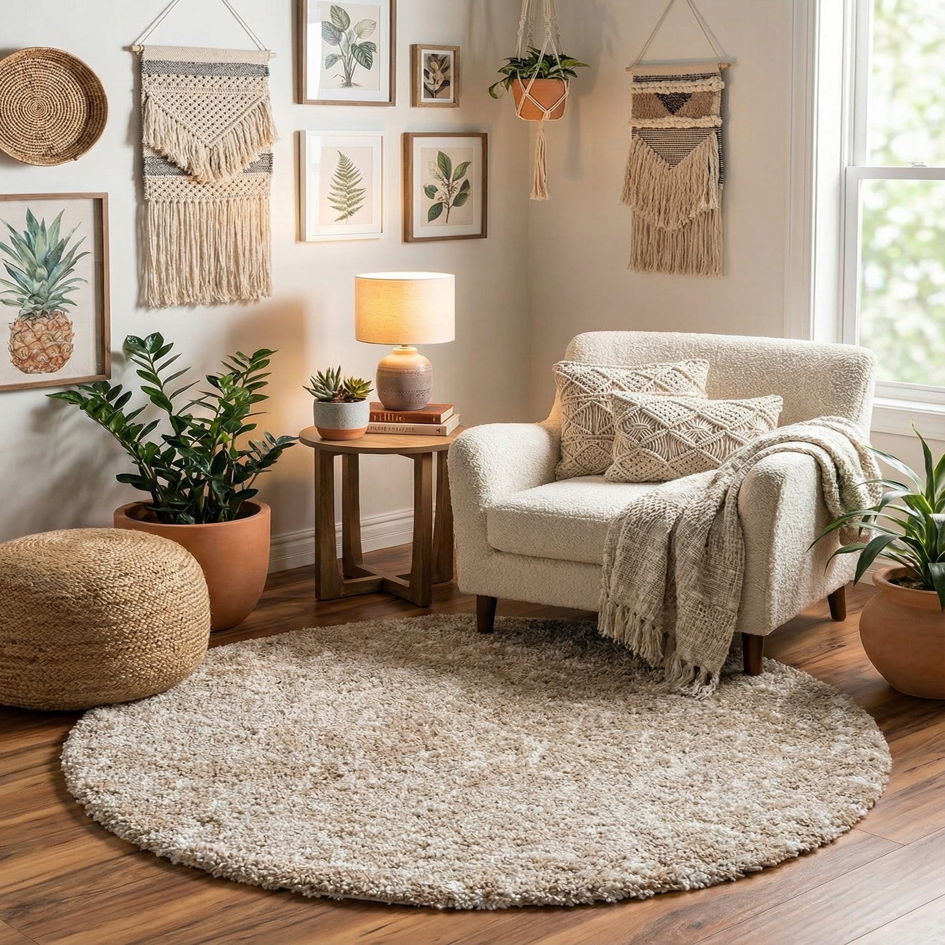 This rug works well in modern, transitional, Scandinavian, coastal, or bohemian-inspired interiors. Use it to soften a reading nook, anchor a small seating group, place in front of a vanity, or layer over hardwood for added warmth and texture. Pair with light wood furniture, neutral linen upholstery, woven accents, and warm metal finishes to enhance the rug’s understated, lived-in feel.