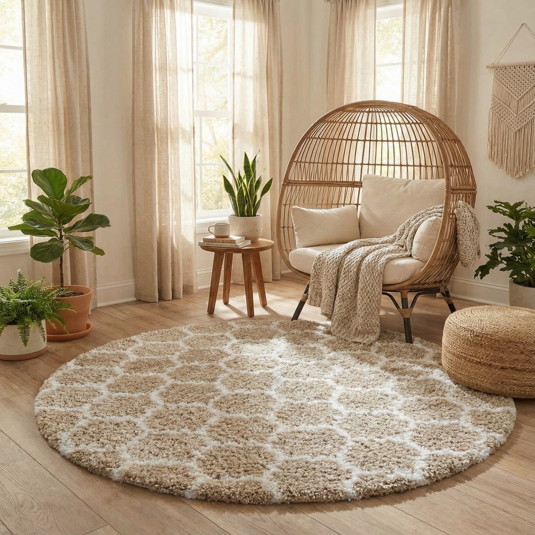 Soft, high-pile shag delivers immediate warmth and texture underfoot, with raised taupe motifs set against crisp ivory outlining. The pattern is a classic Moroccan trellis — rounded, interlocking quatrefoils that add visual rhythm without overpowering a room. Machine made of 100% polypropylene, the fibers hold a dense, cushiony hand and the contrasting pile heights create a subtle sculpted effect you can feel as you walk across it.