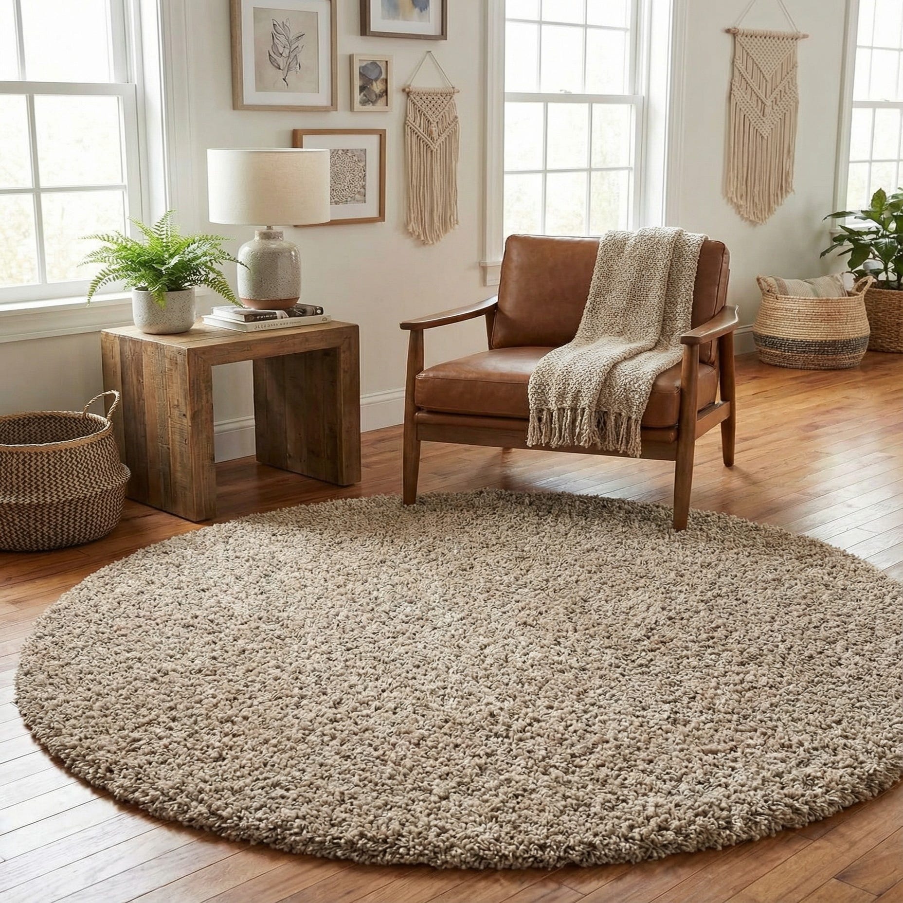 This 5 Ft Round Solid Shag rug is a versatile piece with a lush texture that adds comfort and warmth to any room. The rug's surface showcases a dense pile of 100% polypropylene fibers, creating a plush feel underfoot. A neutral taupe background allows for seamless integration into various decor styles. Machine-woven construction ensures a durable and long-lasting floor covering that is both stain-resistant and shed-free, maintaining its appearance over time.