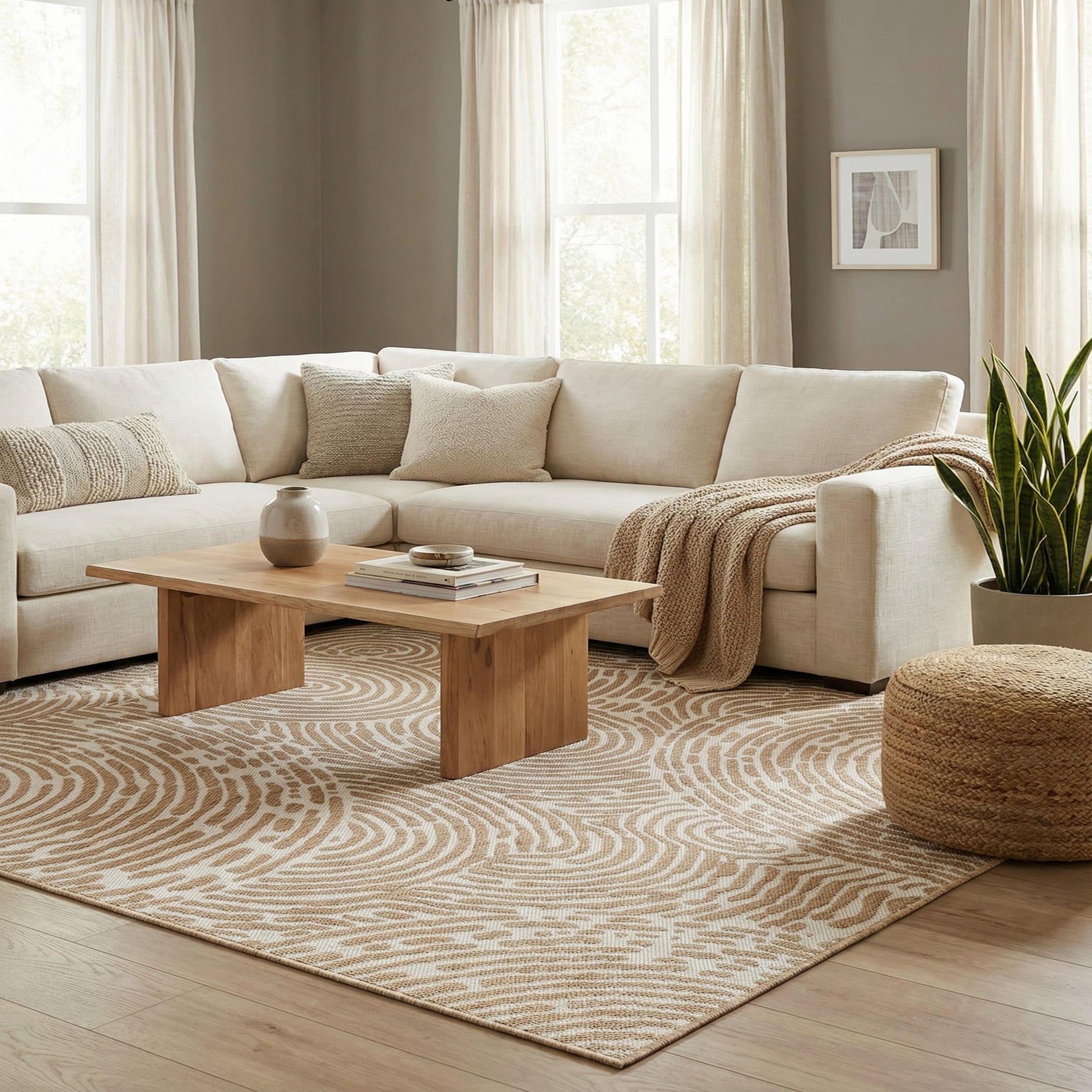 Primary color is Taupe. Colors in this rug include: Taupe, Ivory.