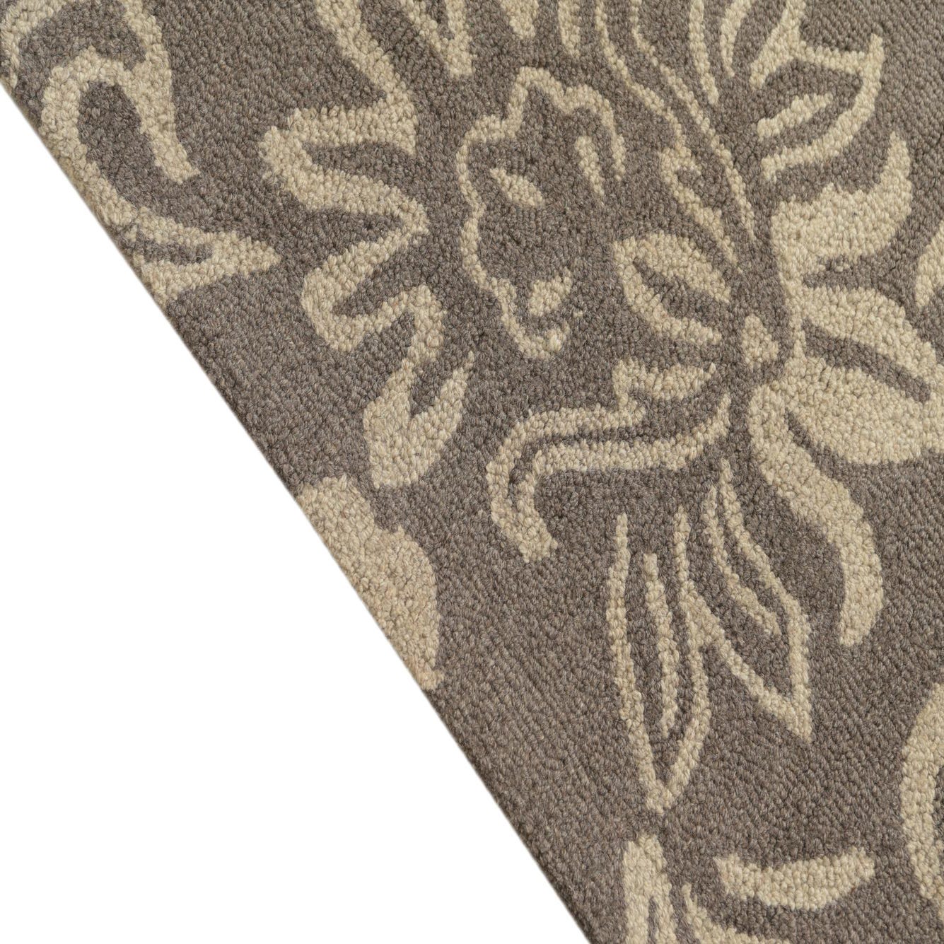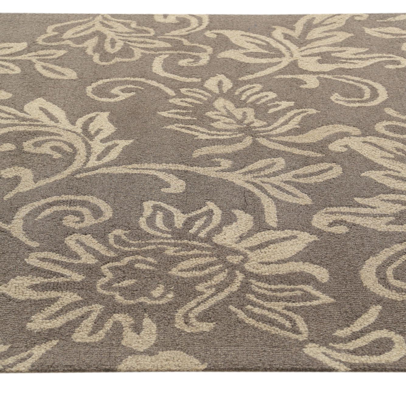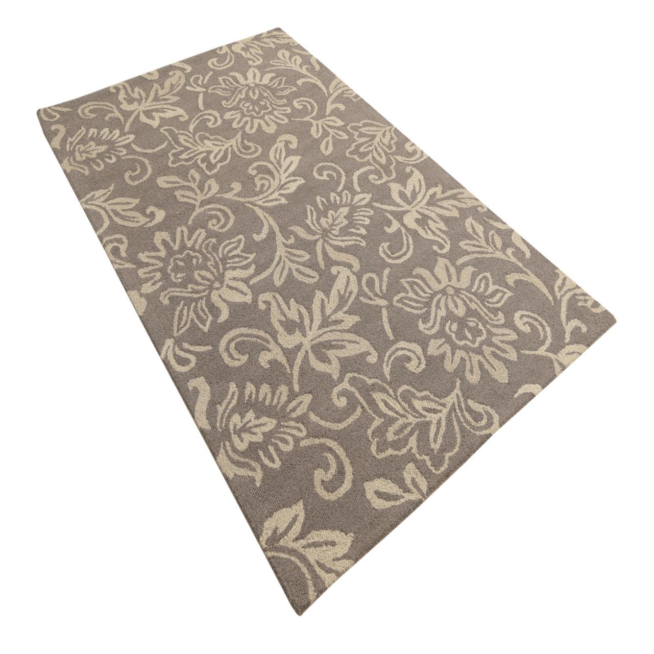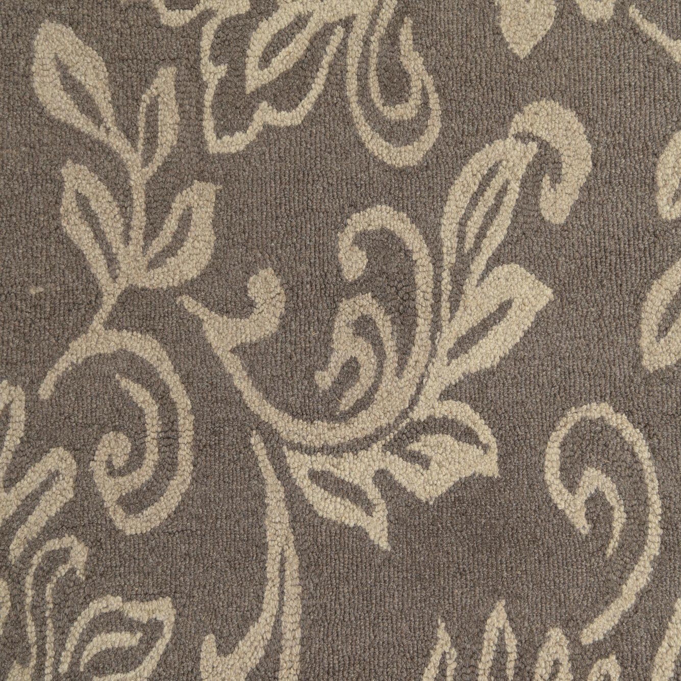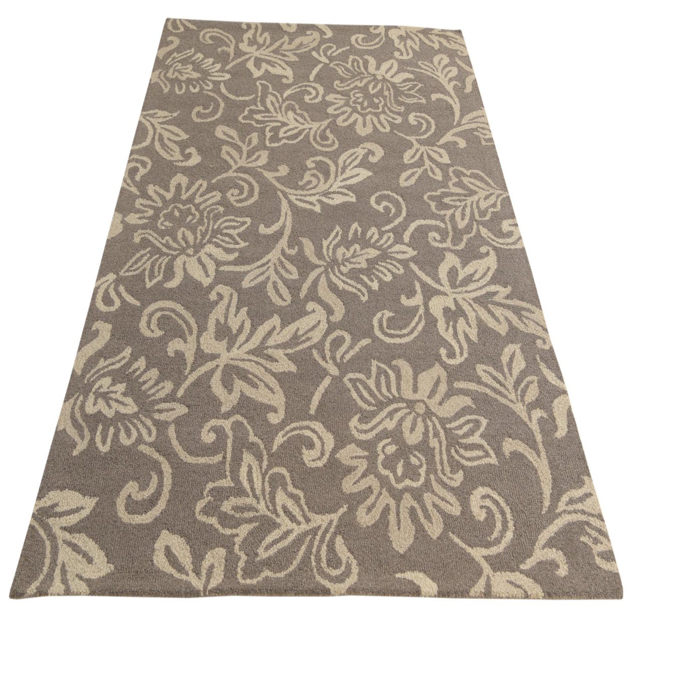 This Agra collection area rug presents a refined floral motif with an understated elegance. The design features traditional florals and tendrils that glide gracefully across the taupe background, highlighted by ivory accents that bring a lightness to the pattern. As a hand-tufted piece, it is crafted from 100% wool, which provides a soft and resilient texture that is pleasing to the touch and durable for regular use.