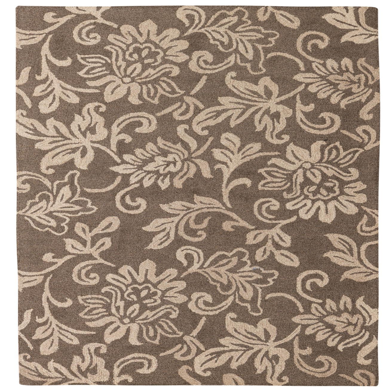 A 5x8 rectangular brown wool rug with a high pile, featuring an ivory farmhouse floral pattern.