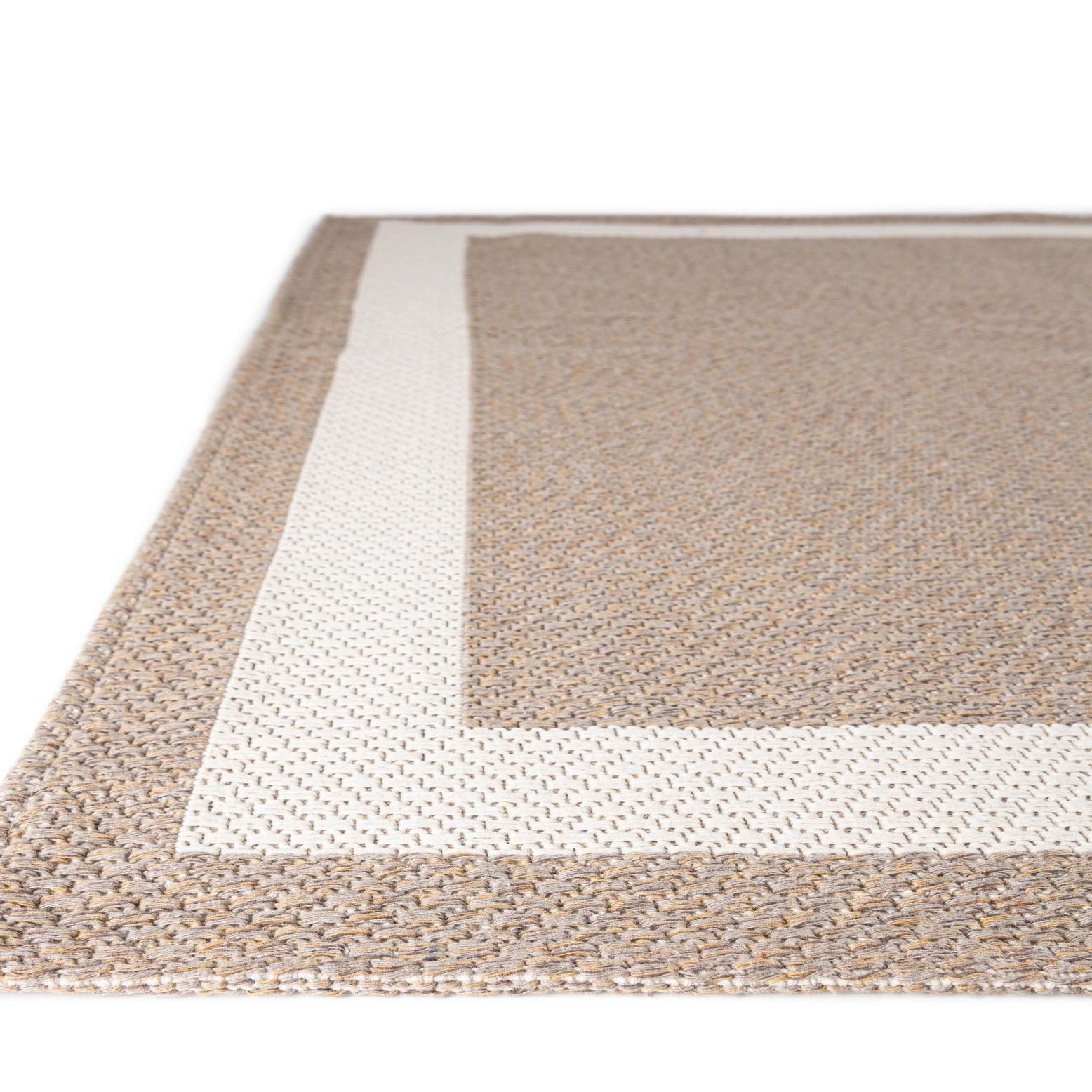 A 5x8 rectangular flatweave rug in a warm tan color with a clean ivory border, suitable for various indoor rooms.