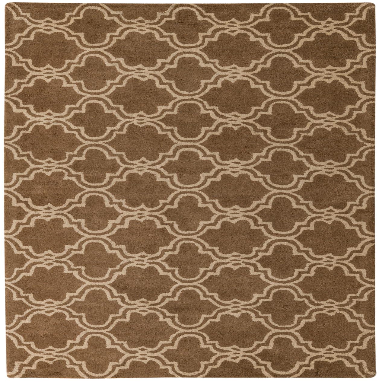 A 5x8 rectangular Luna Collection wool rug featuring a repeating modern abstract pattern in brown and ivory.