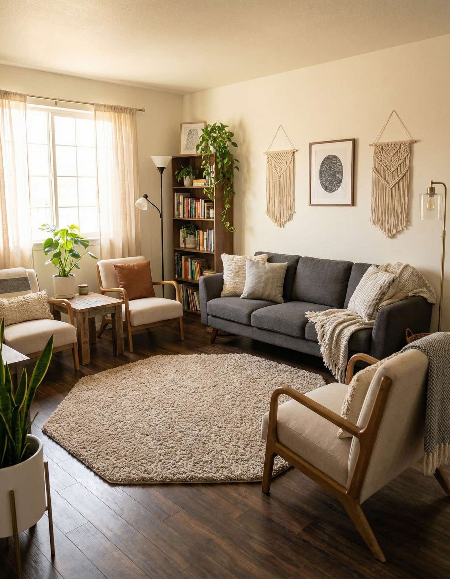Pairs naturally with relaxed, neutral interiors — think light-wood furniture, linen upholstery and woven accents — and works well in casual living rooms, cozy reading nooks, or beside the bed for a soft landing in the morning. The octagon shape also fits nicely under a small round table or in an entryway to define a compact space without overwhelming it.