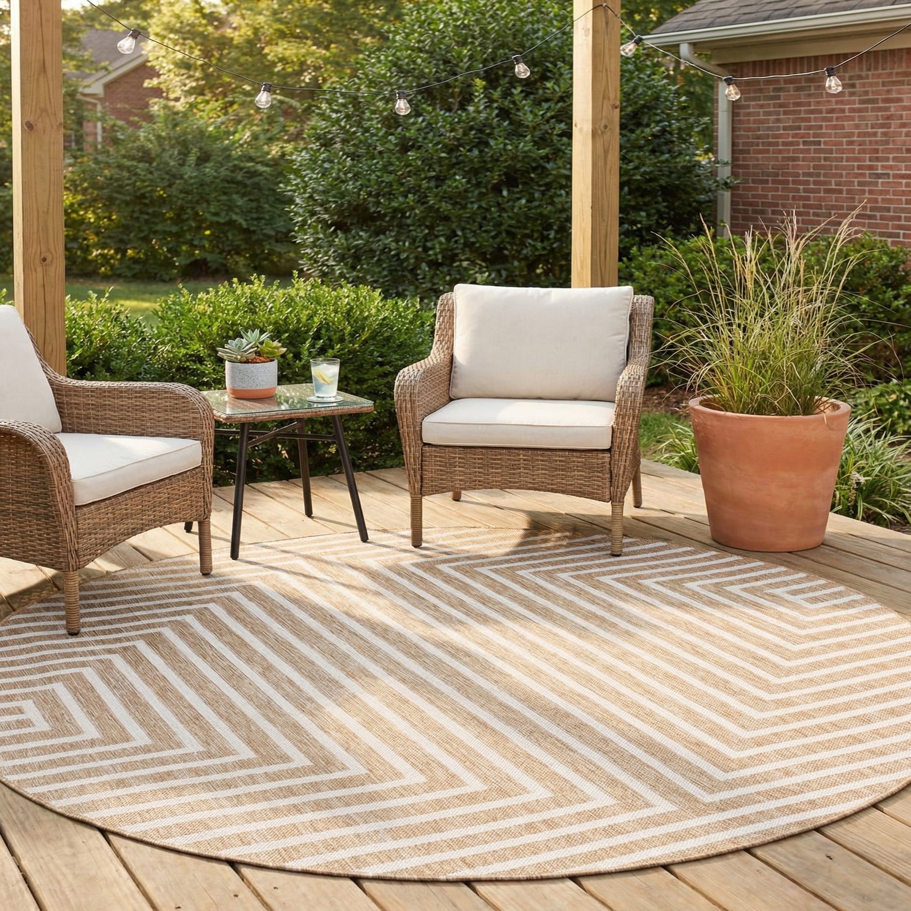 A 6' round brown and ivory modern abstract rug with a geometric striped pattern, suitable for indoor or outdoor use.