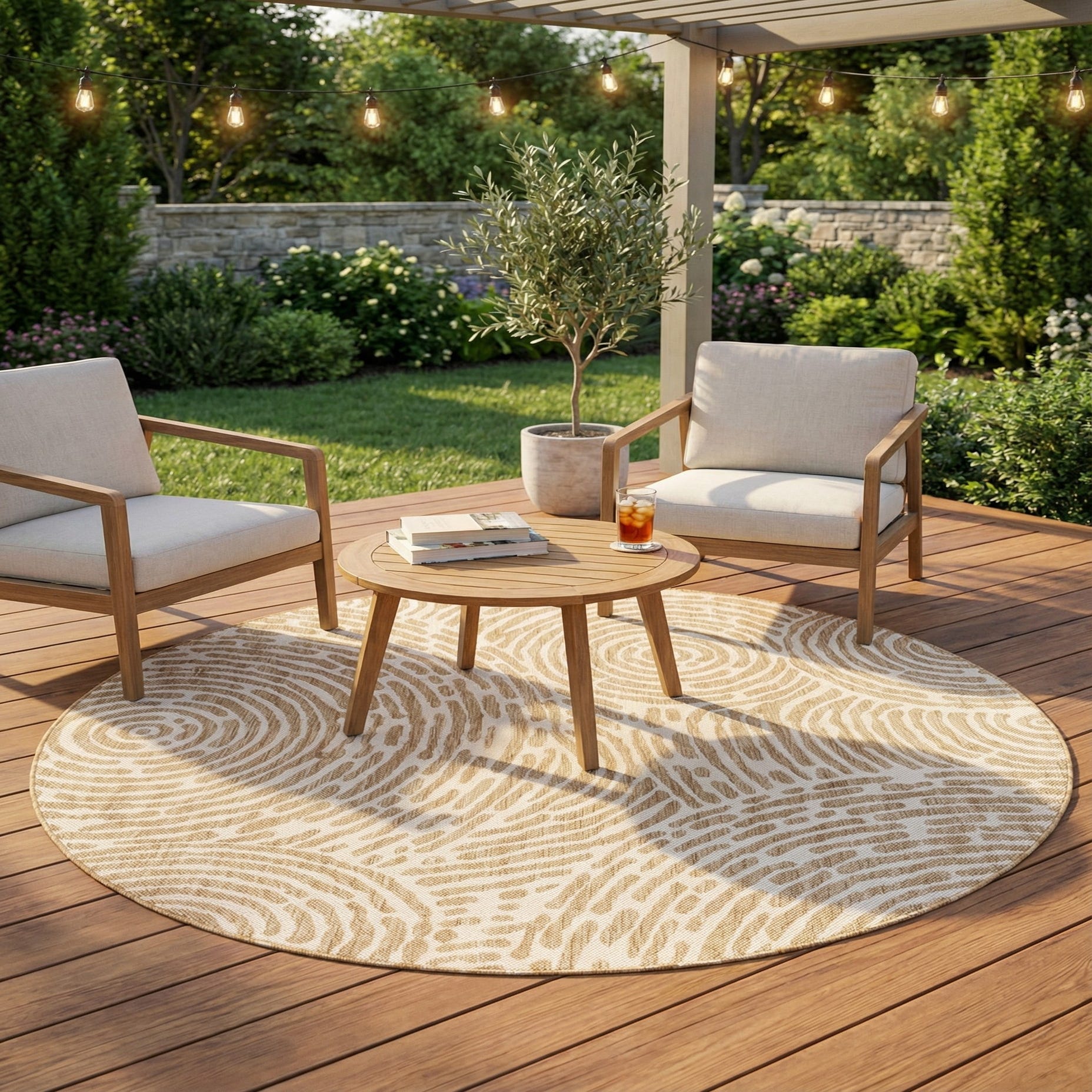 A 6' round brown and ivory modern abstract rug with a fingerprint-like pattern, suitable for indoor or outdoor use.