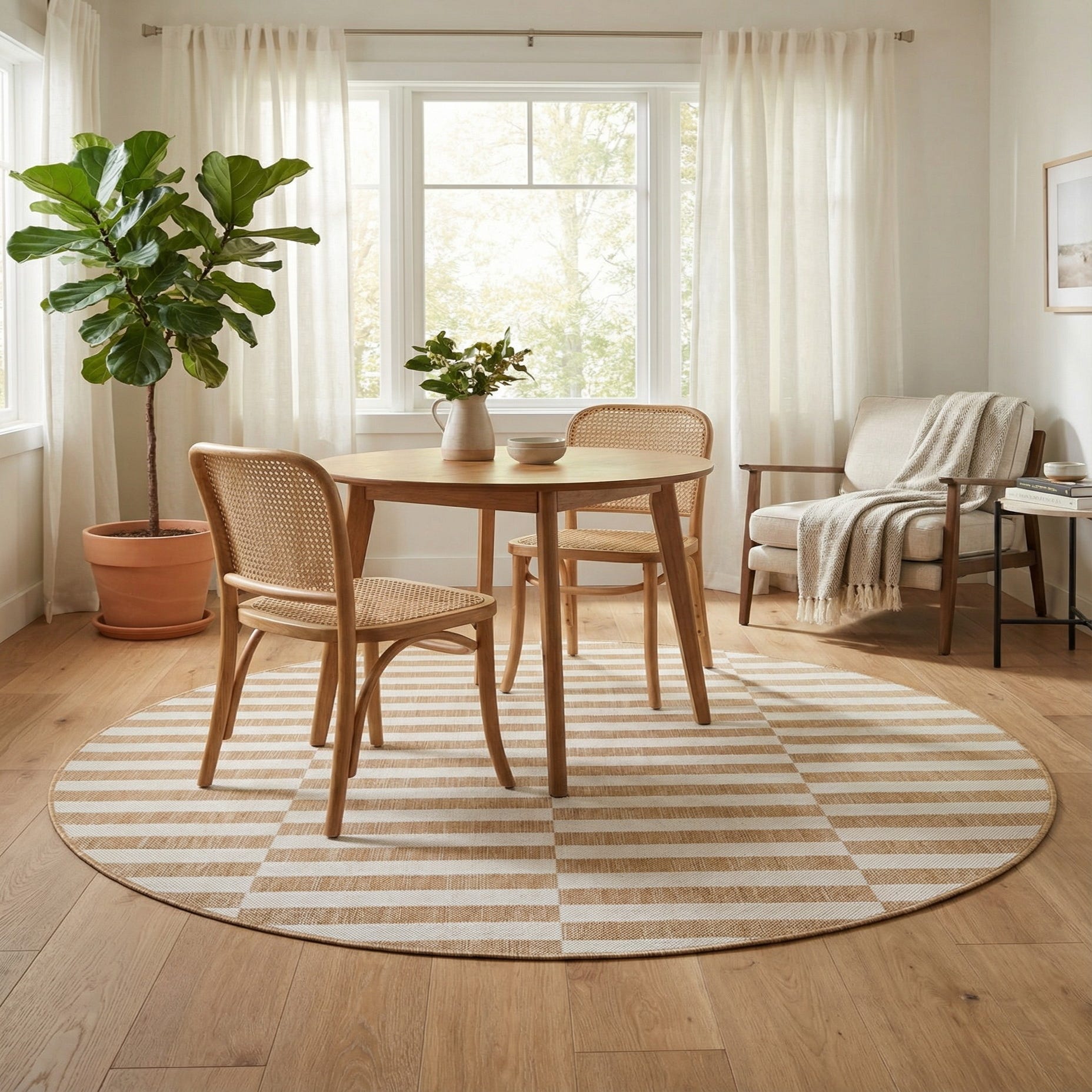 The neutral palette and round shape work well in covered outdoor rooms, a bright sunroom, or a cozy breakfast nook where it can anchor a small dining set or seating cluster. Pair it with rattan or light-wood furniture, white cushions, and green plants for a relaxed coastal or modern farmhouse vibe, or layer it over a natural-fiber mat to add depth on a covered patio.