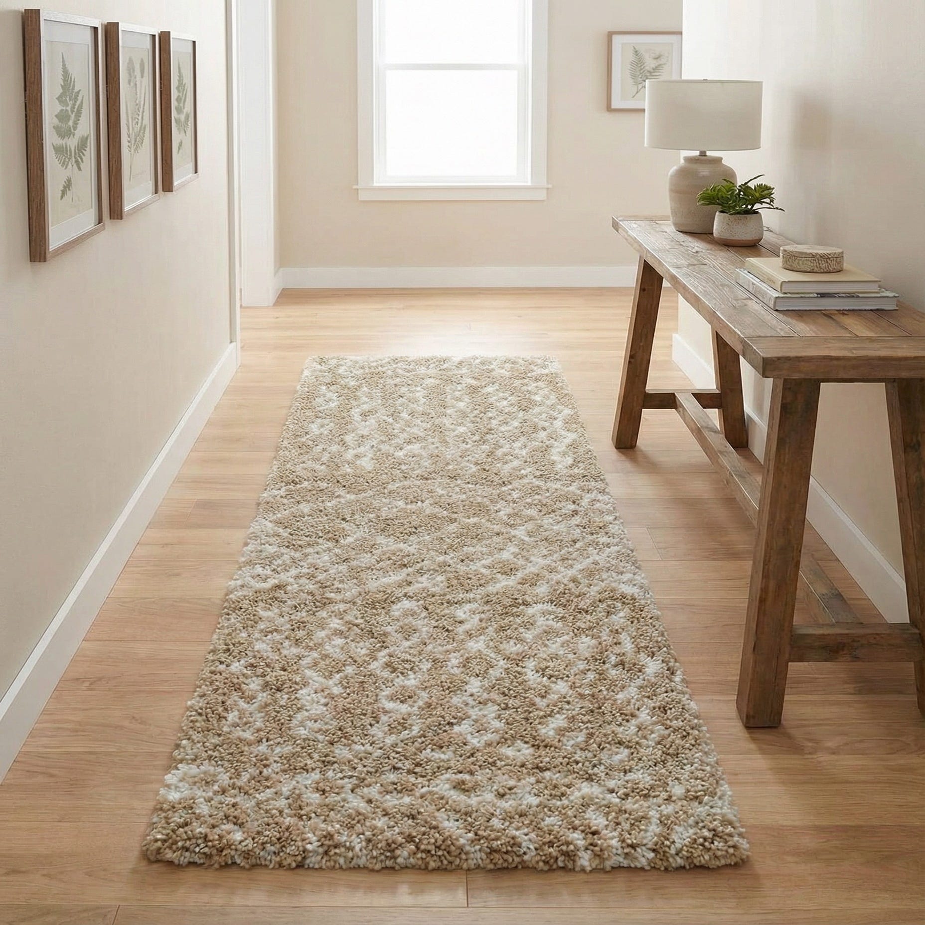 A warm taupe field sets the stage for an ivory geometric motif that draws from classic Moroccan-inspired patterns. The ivory design is created in a slightly taller pile against the taupe background, giving a tactile, dimensional look that you can feel underfoot. Machine-made from 100% polypropylene, the shag surface is plush and springy with a casual, lived-in texture that adds softness and visual interest to narrow spaces.