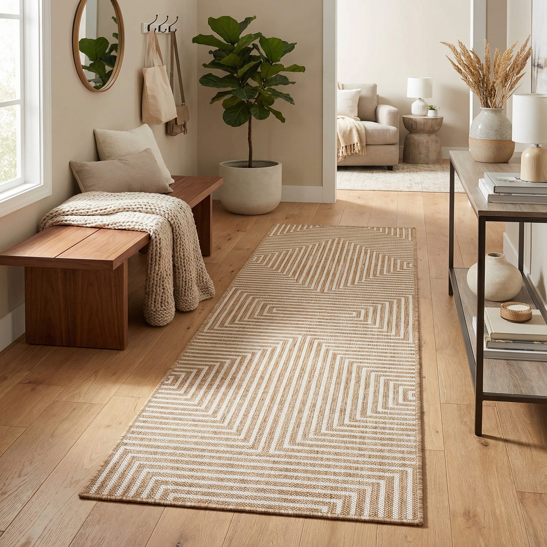 This runner works well in narrow spaces where a defined path is desirable — think hallways, entryways, or alongside a kitchen island — and also adapts to covered outdoor rooms or sunporches where neutral tones pair with natural materials. Pair it with light wood furniture and woven accents for a relaxed coastal-modern look, or use it to soften a minimalist space with metal or black-framed furnishings for a contemporary contrast.