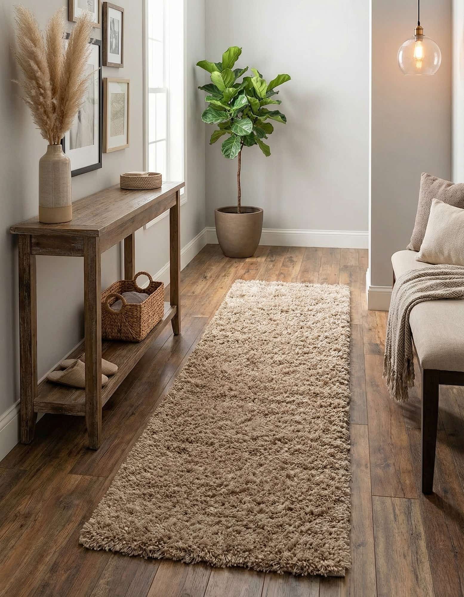 Use this runner to soften a hallway, warm the floor beside a bed, or add a cozy strip down a stair landing. It pairs easily with warm wood finishes, neutral upholstery, linen fabrics, and pared-back decor styles like modern farmhouse, minimalist, or casual contemporary. Layer it beneath a narrow console or place it where you want a soft, tactile pathway through a room.