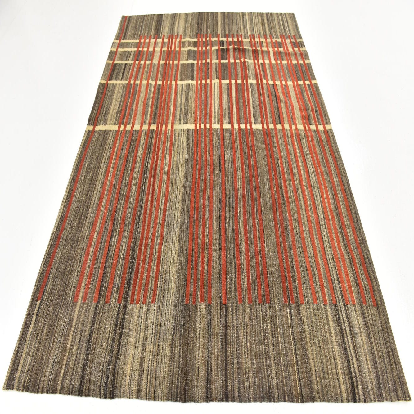 A 6x9 rectangular Kilim Modern wool rug featuring a brown and tan striped background with bold vertical orange and horizontal ivory stripes.