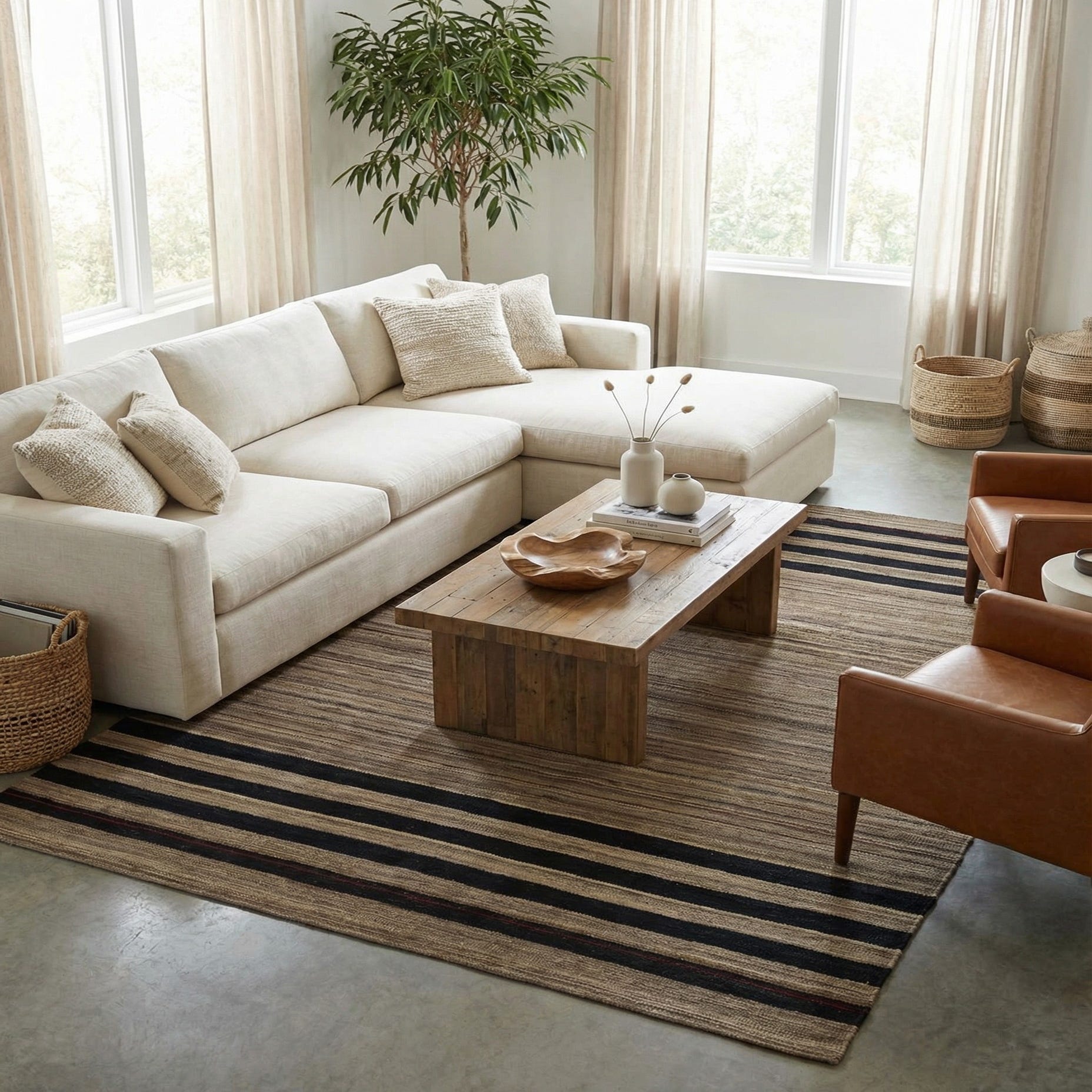 A 6x9 rectangular Kilim Modern rug with a flatweave, featuring horizontal stripes in varying shades of brown, tan, and cream, accented by wider black stripes at the top and bottom.