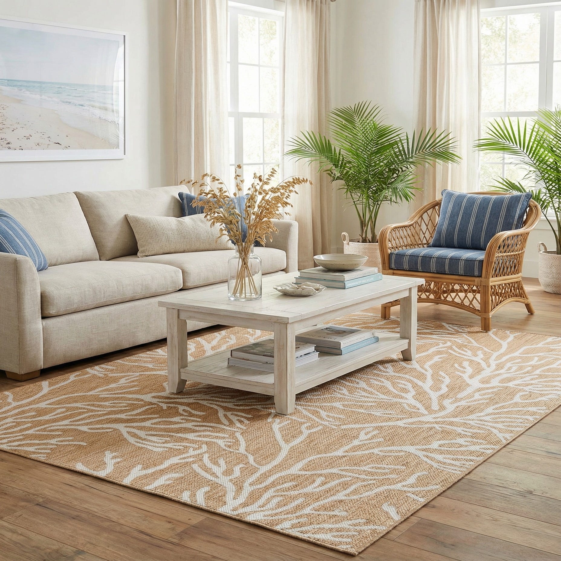 A 6x9 rectangular indoor/outdoor rug featuring a modern coastal coral pattern in tan and ivory.