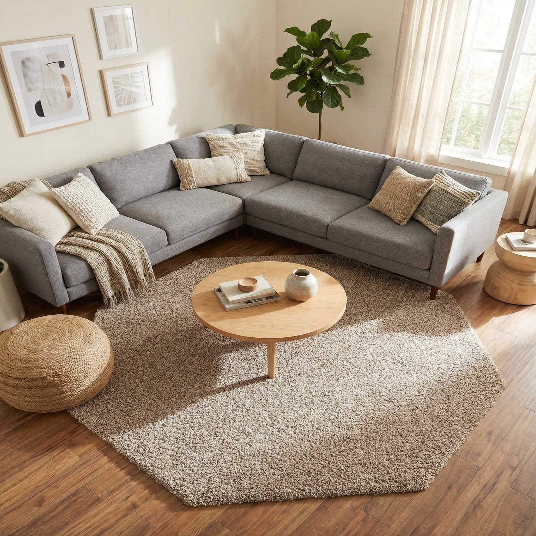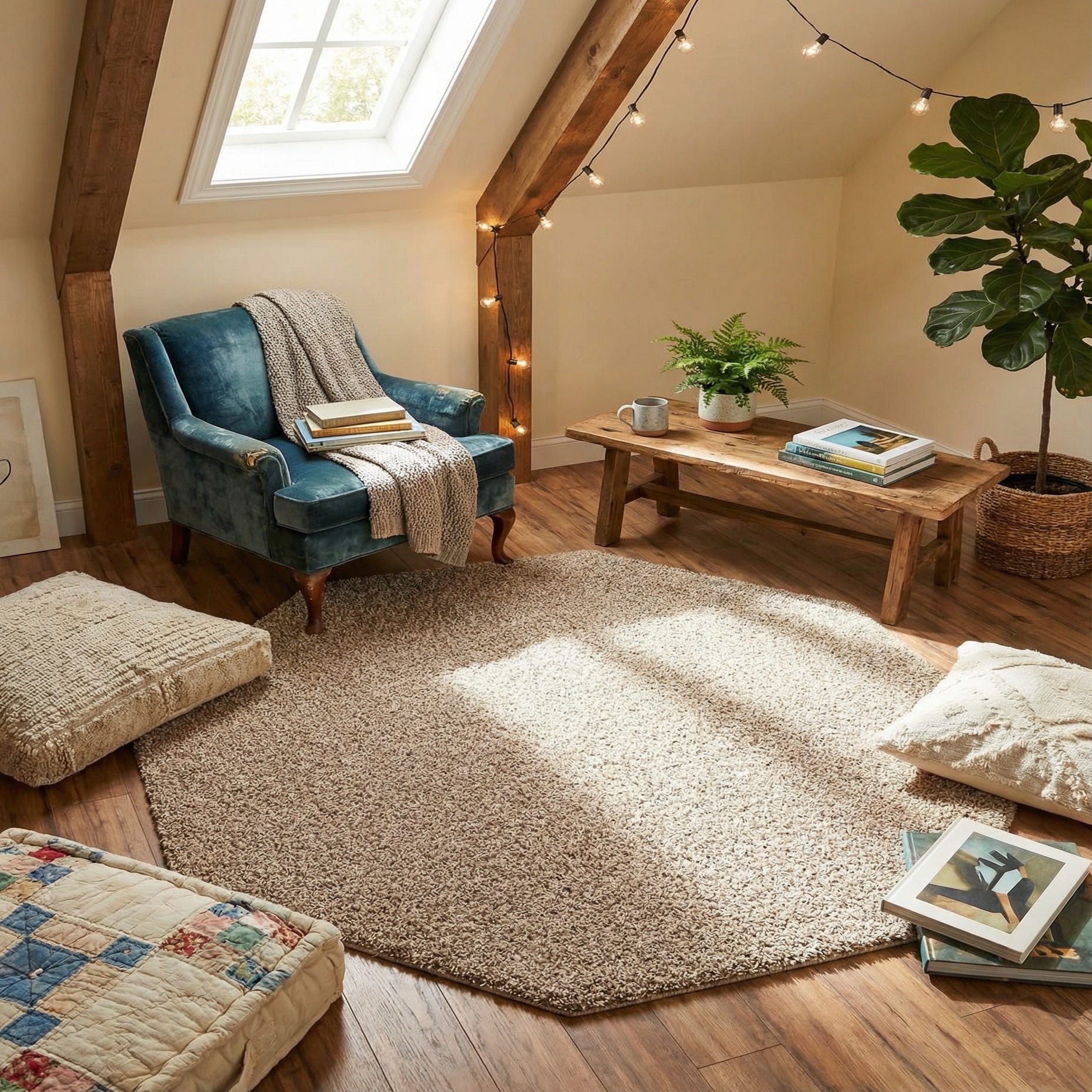 This rug works well in relaxed and contemporary interiors — place it beneath a small seating group to anchor a conversation area, beside the bed for a cozy morning step, or in a corner reading nook to soften the space. The octagonal shape adds a geometric twist to entryways or under round tables and layers neatly over larger rugs to introduce shape and texture. Pair it with light woods, neutral upholstery, and soft textiles for a calm, inviting room.