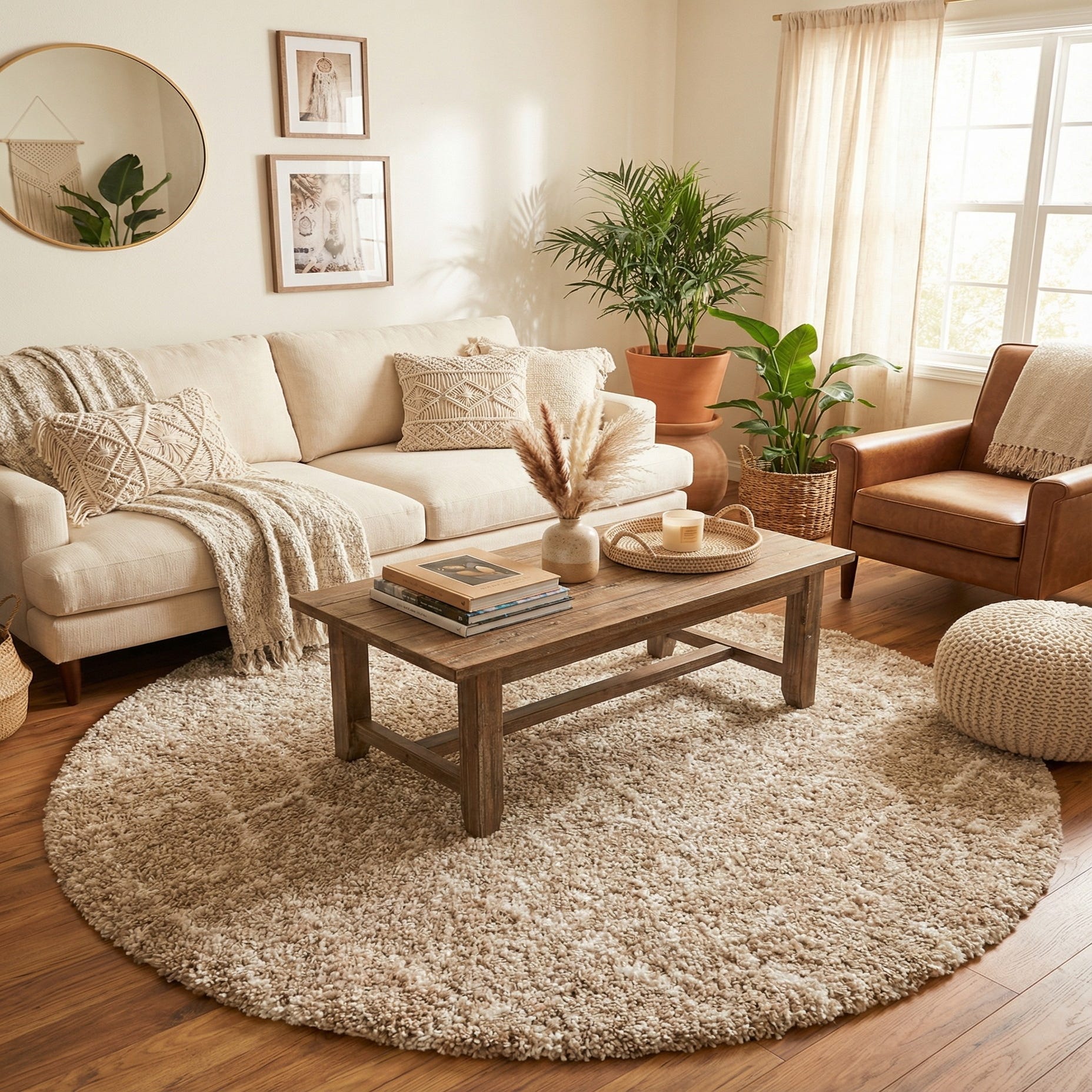 Machine-made from 100% polypropylene, this rug offers consistent construction and reliable performance for everyday areas. It works well centered beneath a round dining table, anchoring a seating group, or adding softness to a bedroom or nursery. Pair it with light woods, linen upholstery, rattan accents, or a neutral minimalist palette for a relaxed, modern feel that leans into Scandinavian, coastal, or modern farmhouse interiors.