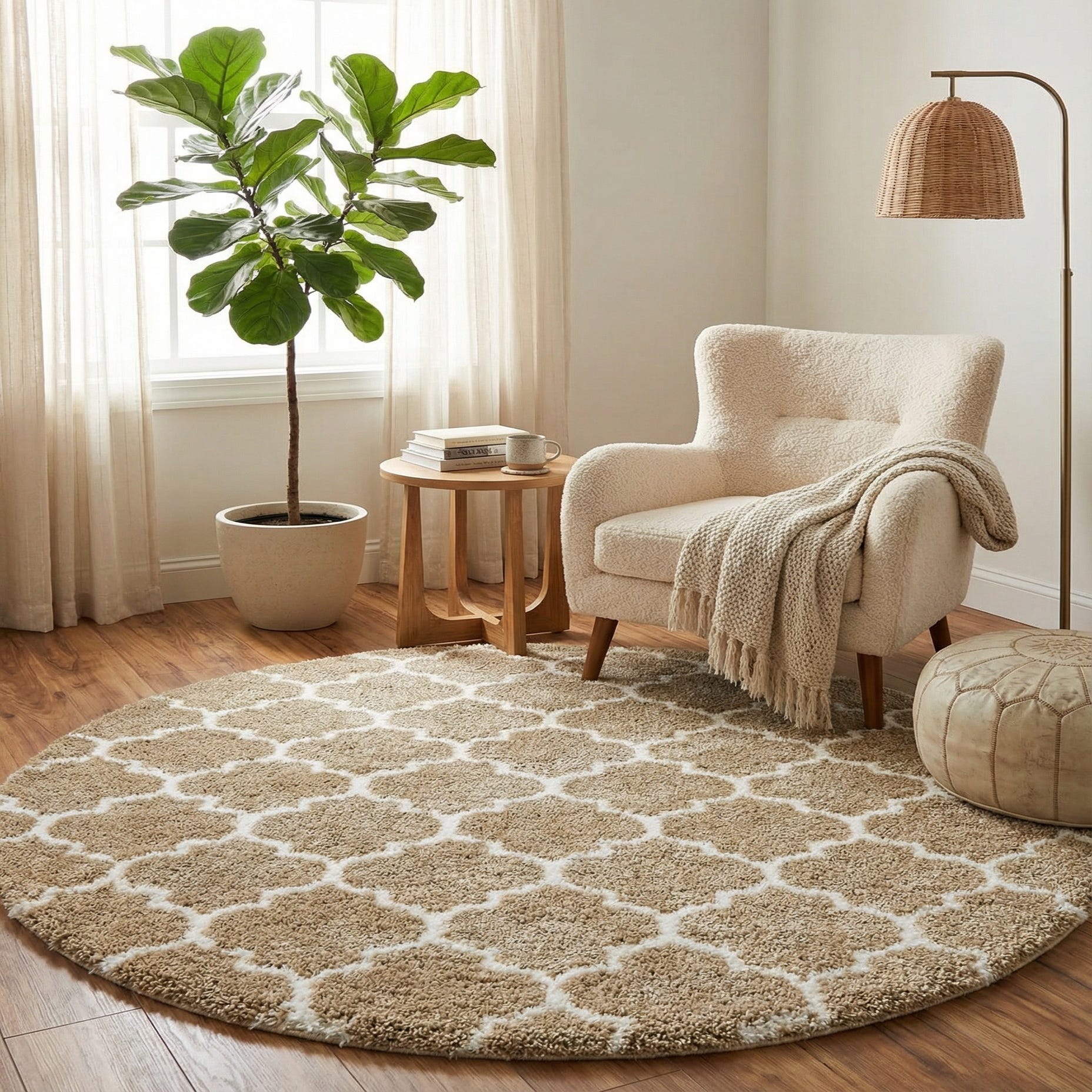 A round, plush 8' 0 x 8' 0 Moroccan Shag rug featuring a tan background with an ivory trellis pattern.