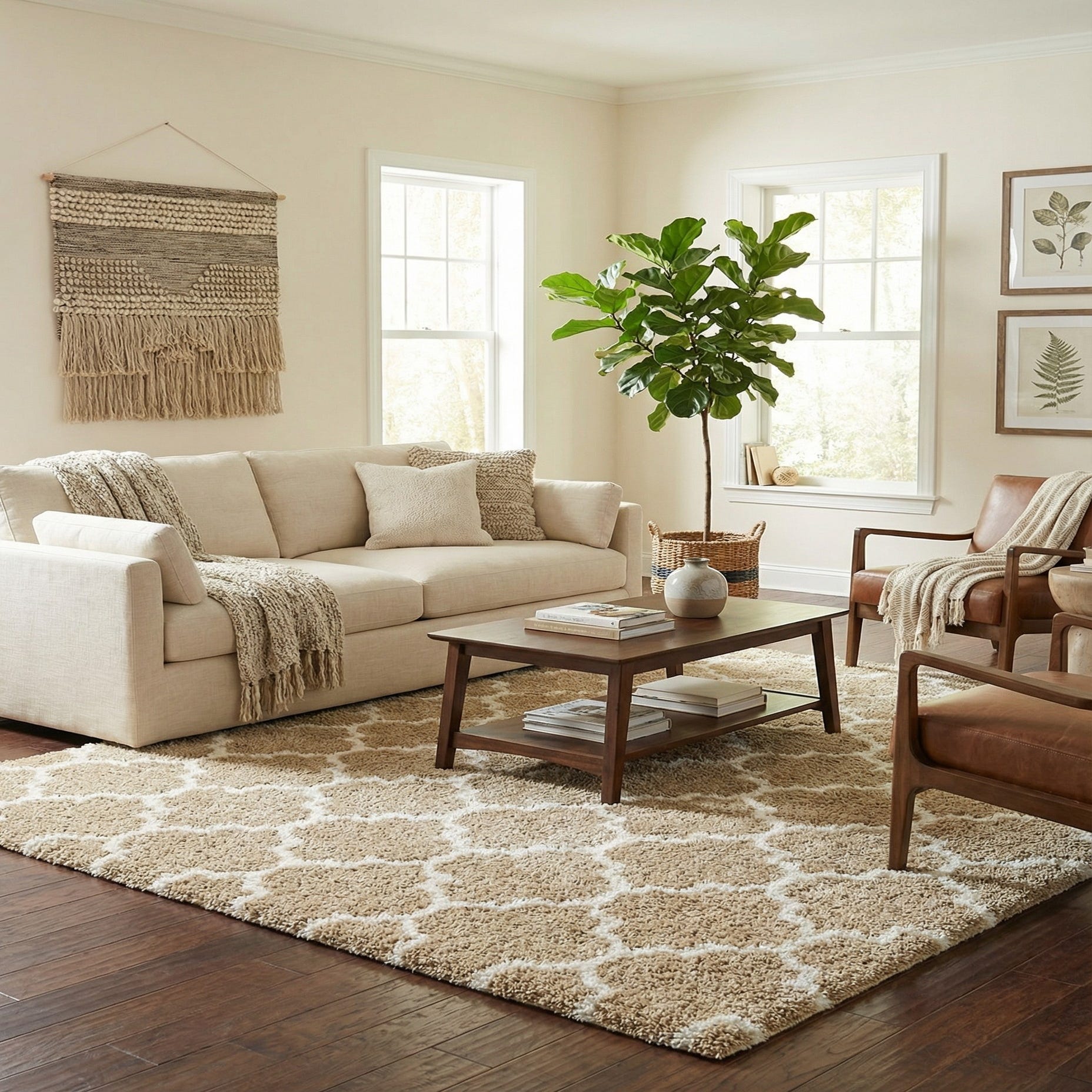 This neutral palette and timeless pattern work well in transitional and contemporary interiors as well as more casual styles like modern farmhouse or boho. Place it beneath a low-profile sofa and coffee table to anchor a living area, layer it in a cozy reading nook, or bring extra warmth and texture to a bedroom. Pair with warm wood tones, linen upholstery, and soft accent colors for a comfortable, layered look.