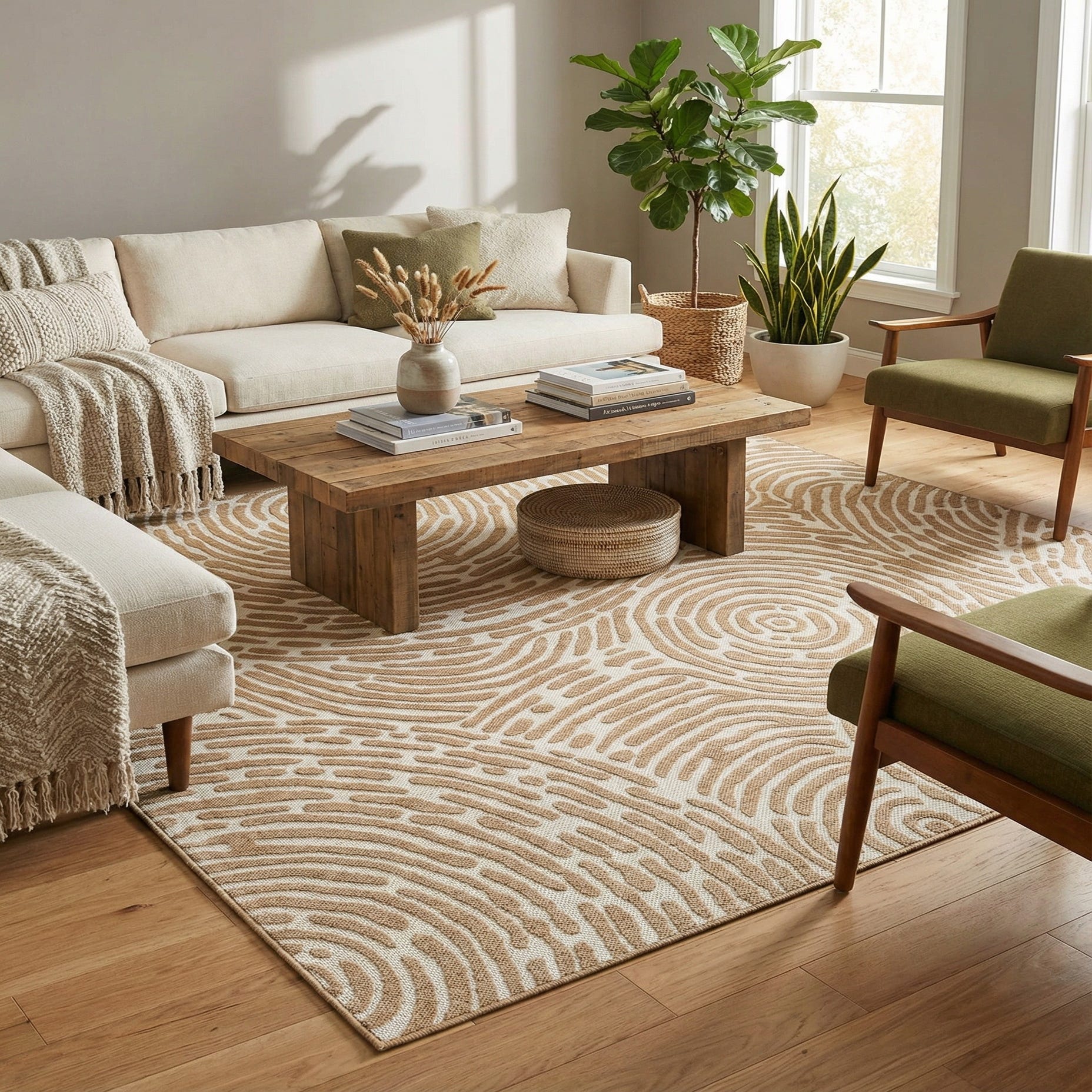 A 7' 10 x 7' 10 square Rugs.com Outdoor Modern rug with an abstract tan and ivory concentric circle pattern, suitable for a patio.