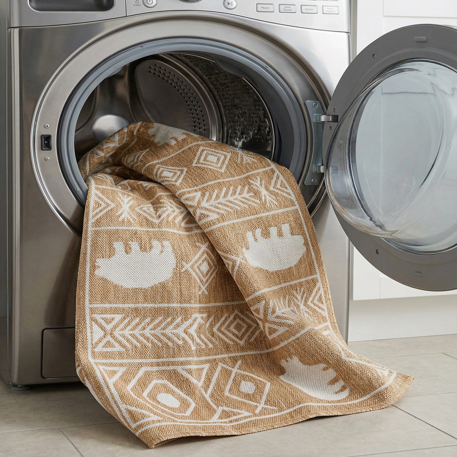 A square 7' 10 x 7' 10 brown and ivory Southwestern rug with tribal patterns and bear silhouettes, suitable for indoor or outdoor use.