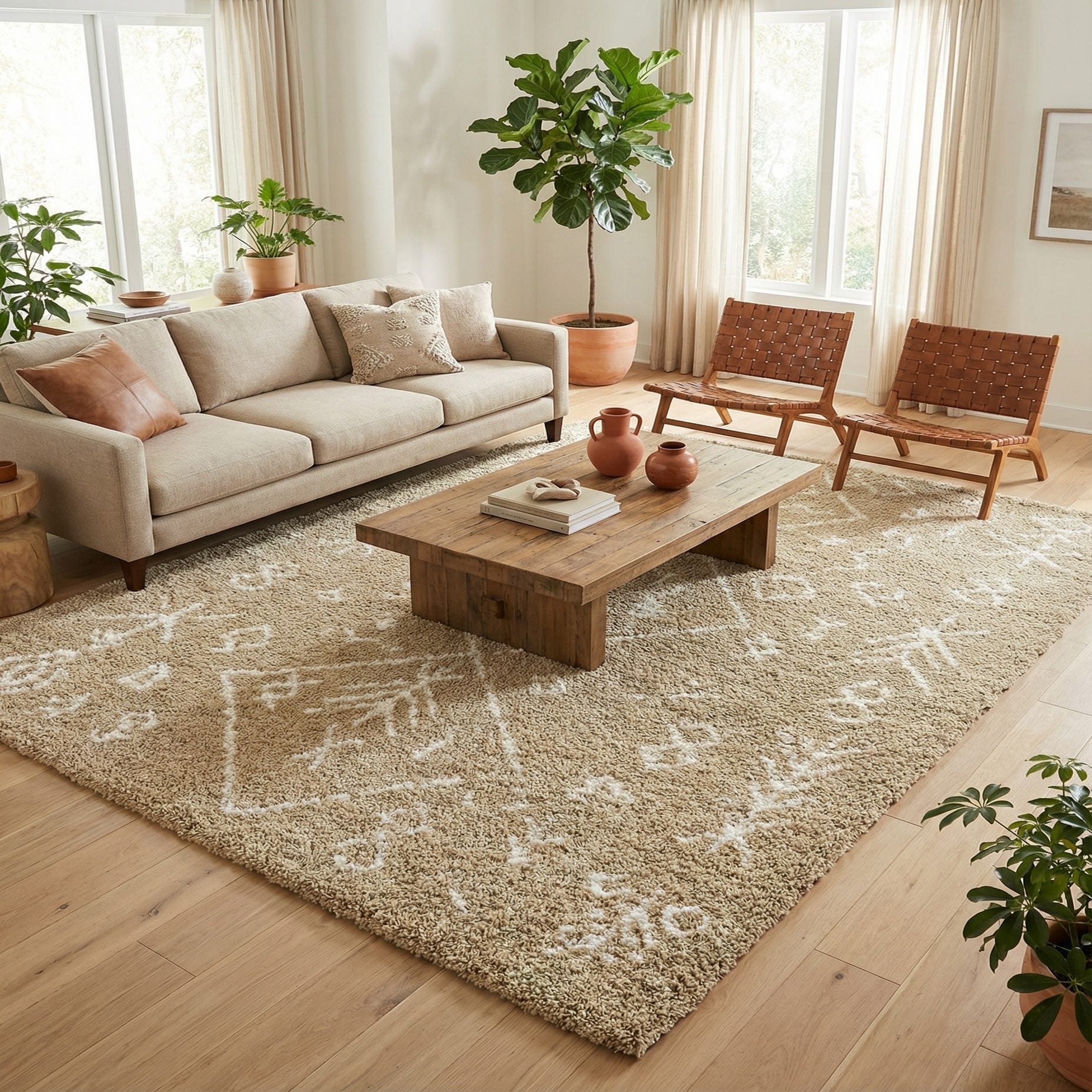 The rug's neutral color palette in taupe and ivory offers versatility, making it suitable for an array of interior designs. It's an ideal choice for adding warmth and texture to modern, contemporary, or Scandanavian-themed spaces. This rug could serve as a grounding element in a living room, underpinning a seating arrangement, or imparting a cozy ambiance to a bedroom setting.