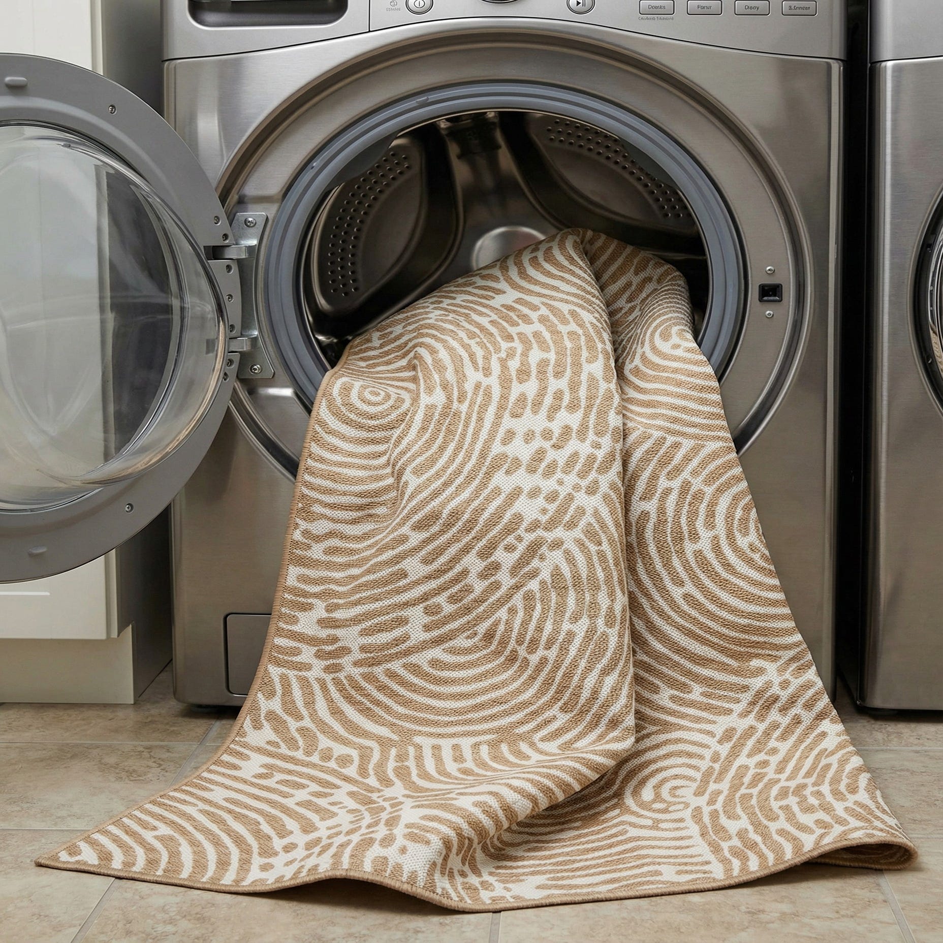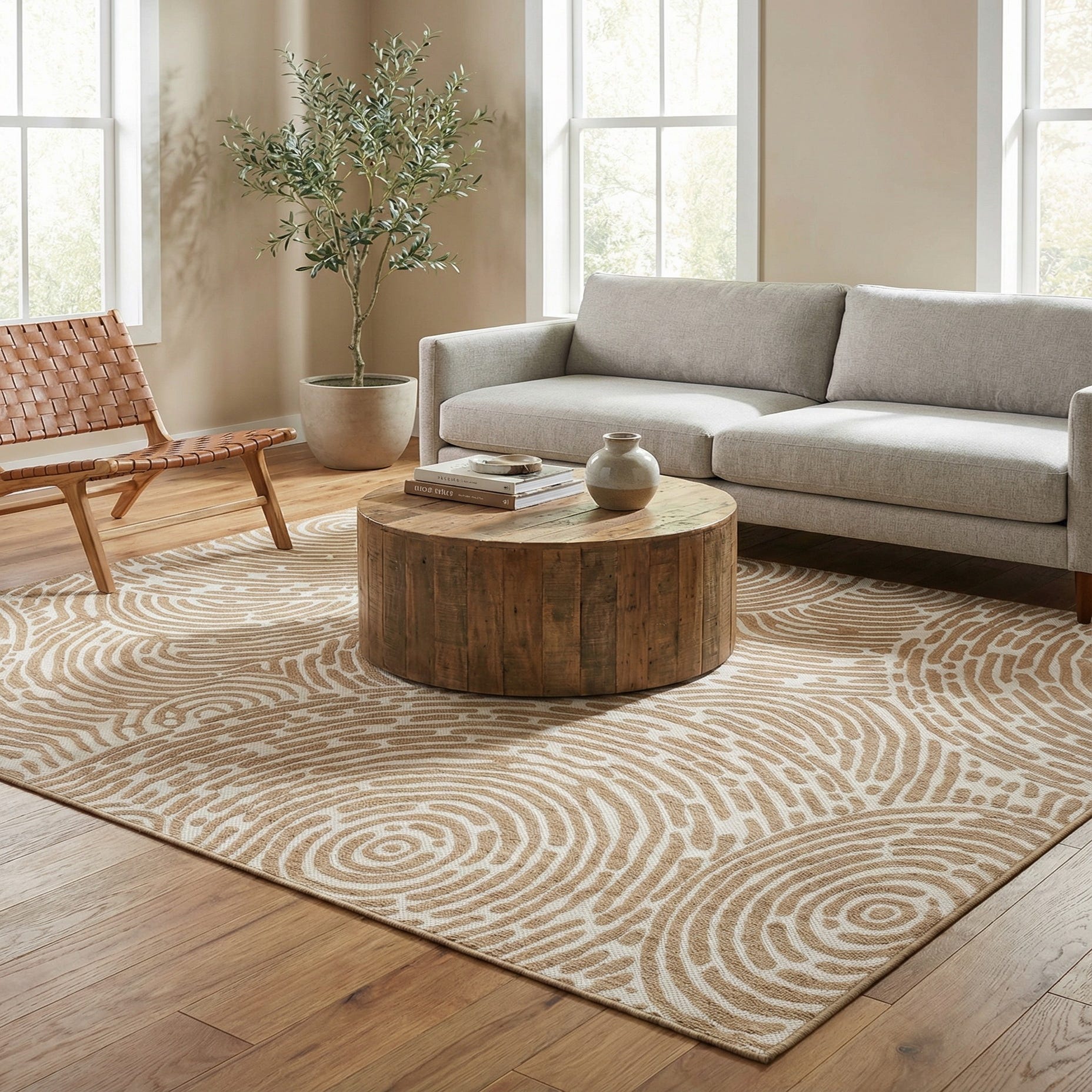A series of concentric, irregular rings and dotted strokes create an organic ripple motif that moves across a warm taupe background. The pattern is rendered in a soft ivory that provides crisp contrast while keeping the overall look natural and restrained. Machine-made from 100% polypropylene, the rug has a low-profile, tightly woven construction with a subtle low-relief texture you can feel underfoot—smooth and slightly textured rather than plush, designed to hold its shape and pattern.