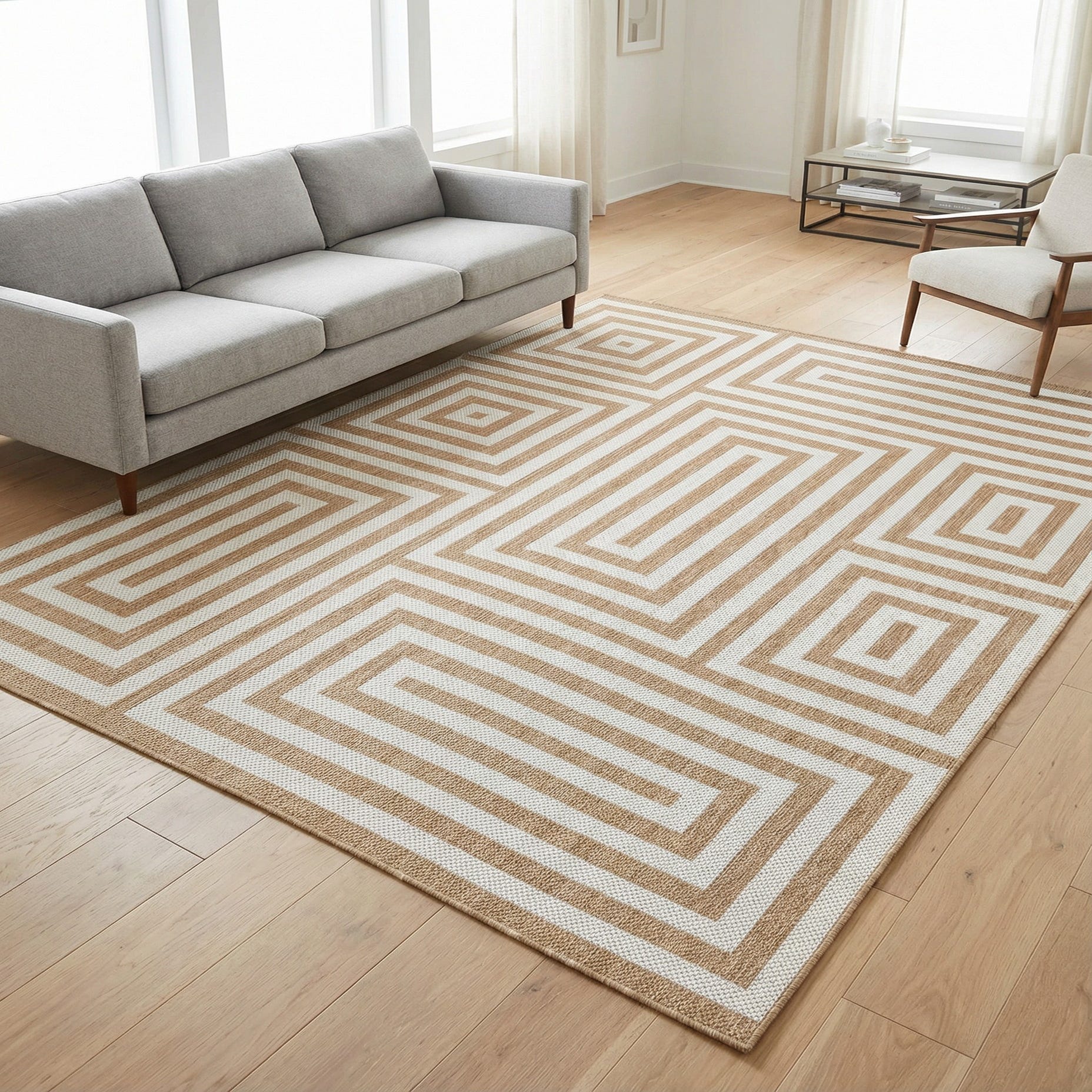 A graphic arrangement of nested rectangles and squares creates a clean, architectural pattern across a warm taupe ground. Crisp ivory bands form the geometric grid, alternating between square and elongated rectangular motifs for visual rhythm. The machine-made construction in 100% polypropylene produces a low-profile, flatwoven surface with a subtle woven texture that feels smooth underfoot while displaying a tactile, tightly looped finish.