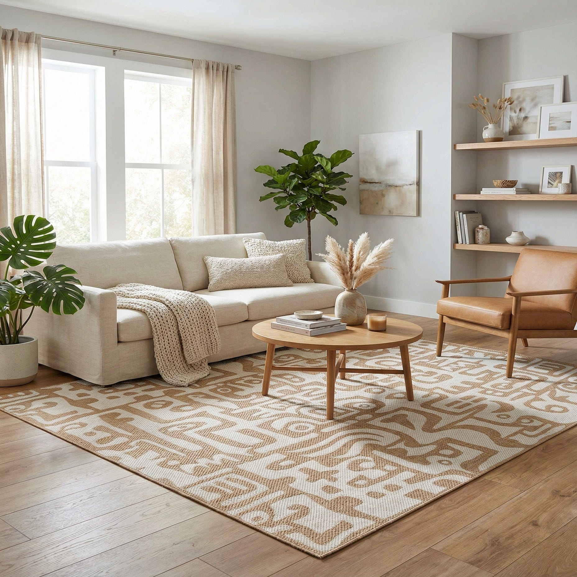 This neutral palette and graphic pattern work well with natural materials and clean-lined furniture: place it under a teak dining set on a covered patio, beneath a wicker seating group with linen cushions in a sunroom, or as a grounding piece in a contemporary living room with light-wood furnishings. Pair it with soft blues or sage greens for a coastal vibe, or layered textures like rattan, metal, and woven throws for relaxed, modern spaces.