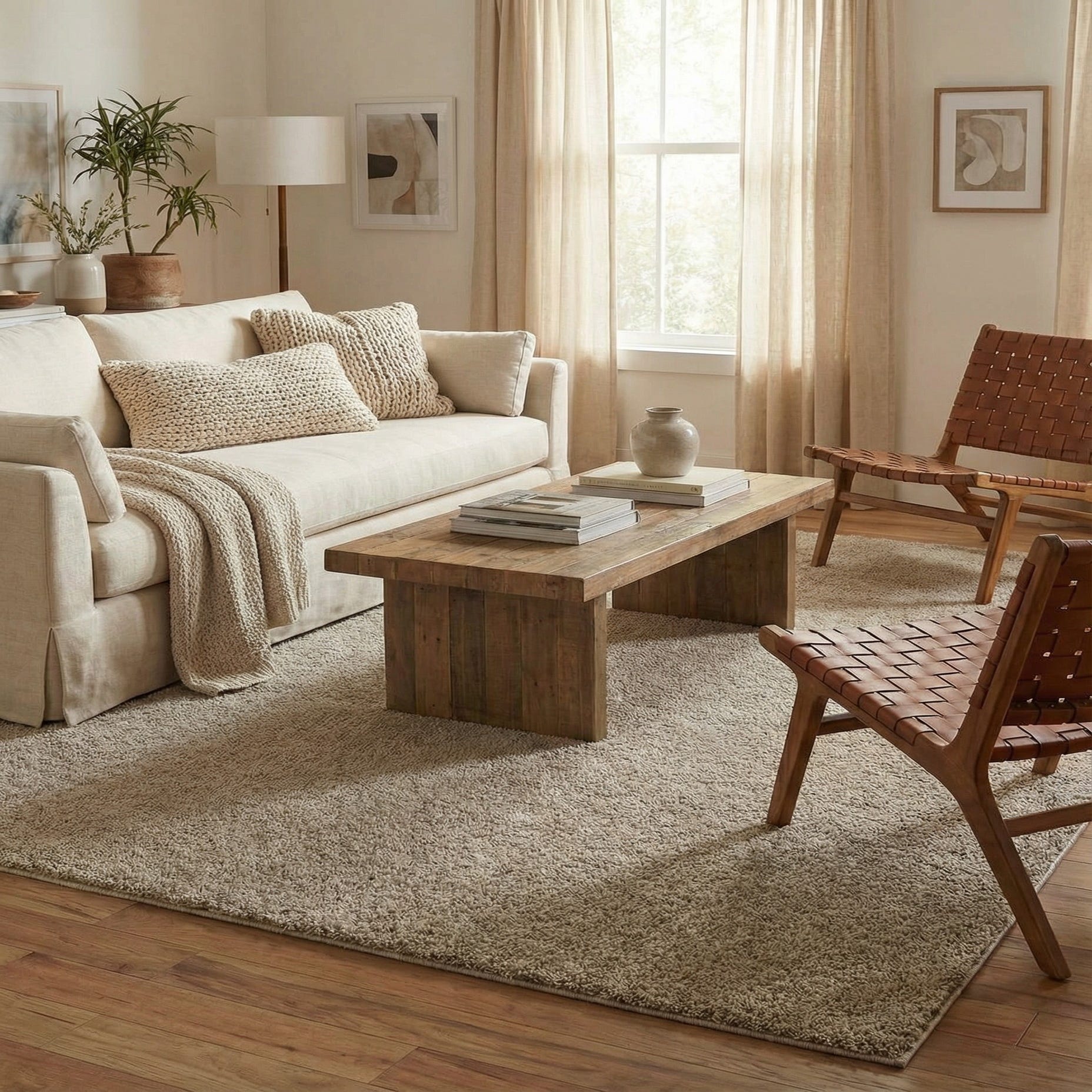 A solid field of warm taupe creates a calm, neutral foundation for any room. The rug is machine made from 100% polyester with a plush shag pile that feels cushiony underfoot and offers a soft, tactile surface. Its uniform, monochrome pattern keeps the look minimal and versatile, while the dense fibers have a gentle luster that adds depth without drawing attention away from other design elements.