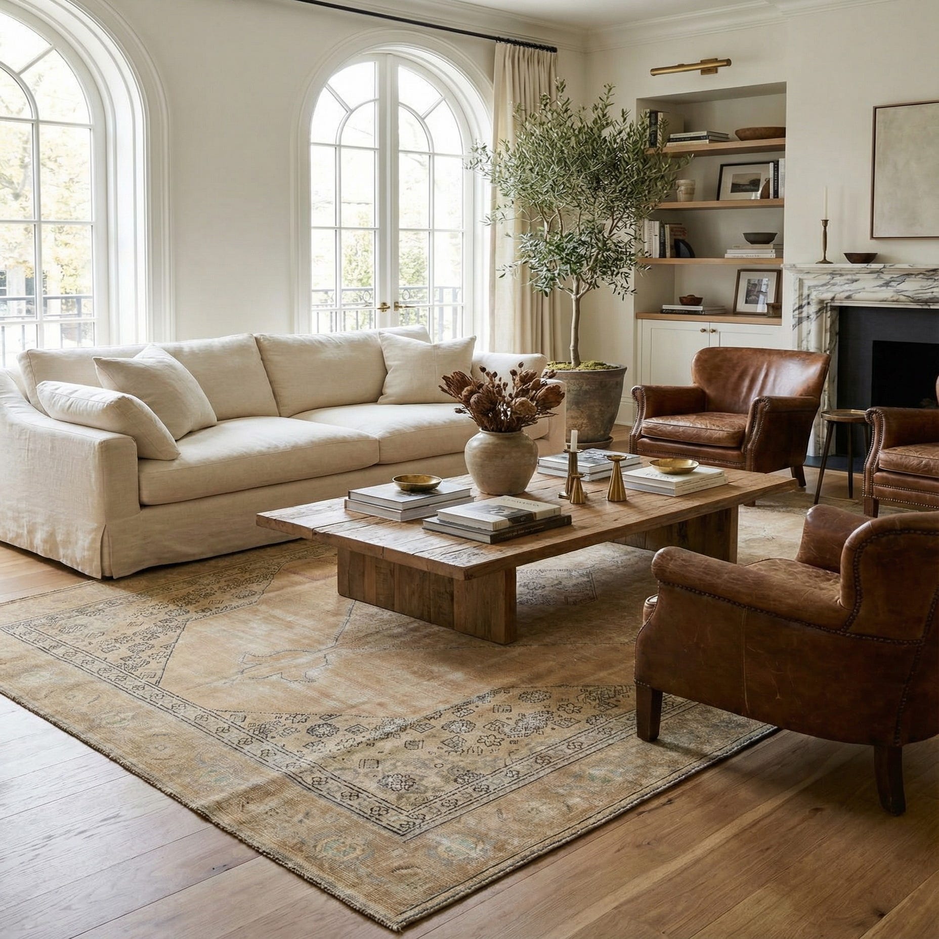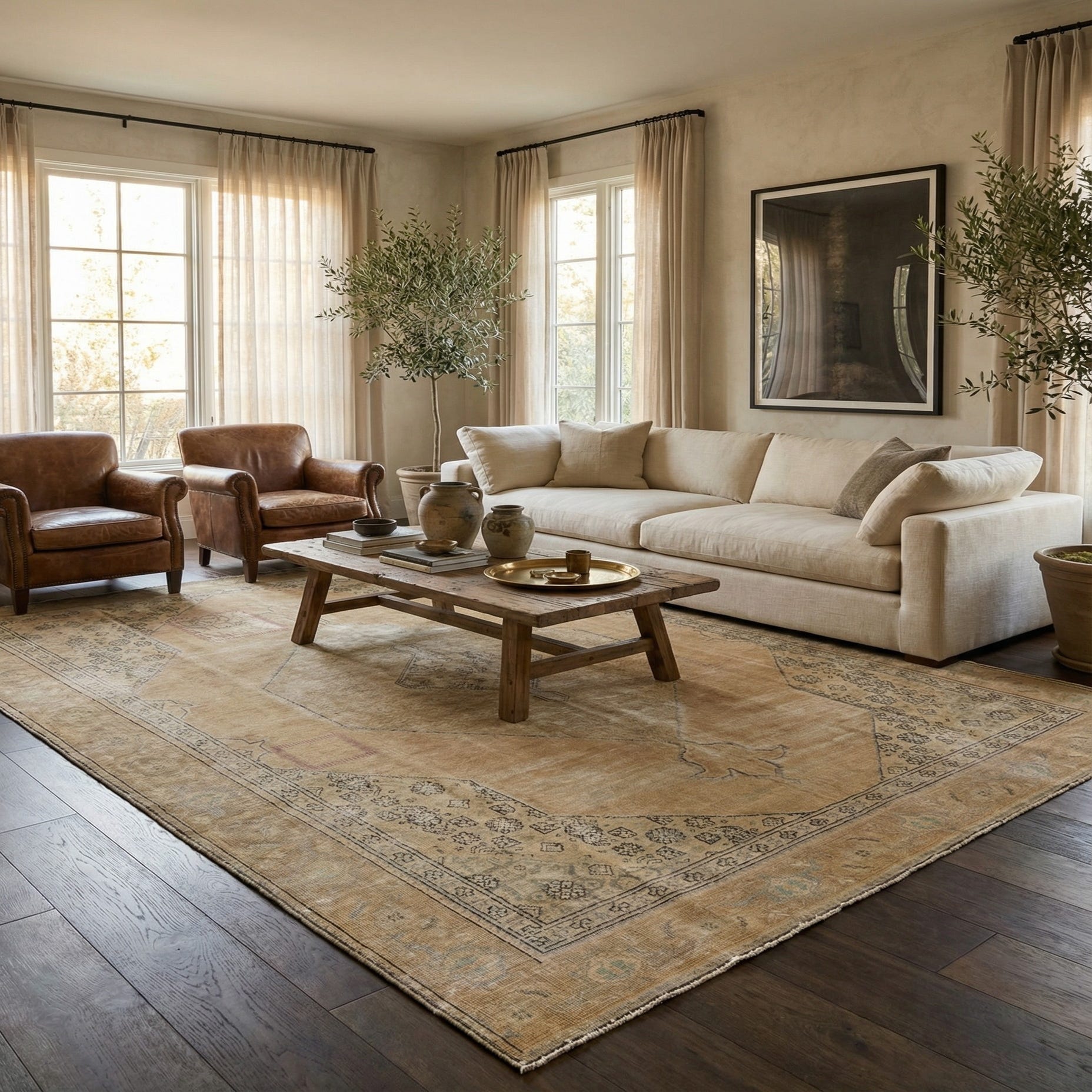 Hand-knotted of 100% wool, the pile has a soft, tactile quality with gentle variations that catch light and emphasize the rug’s vintage character. Place it under a living-room seating group to ground neutral sofas and warm wood tones, beneath a dining table to add quiet patterning to meals, or layered in a bedroom to create an inviting foundation for linen bedding and muted décor. It pairs well with classic, transitional, or modern farmhouse interiors and complements both light and dark flooring.