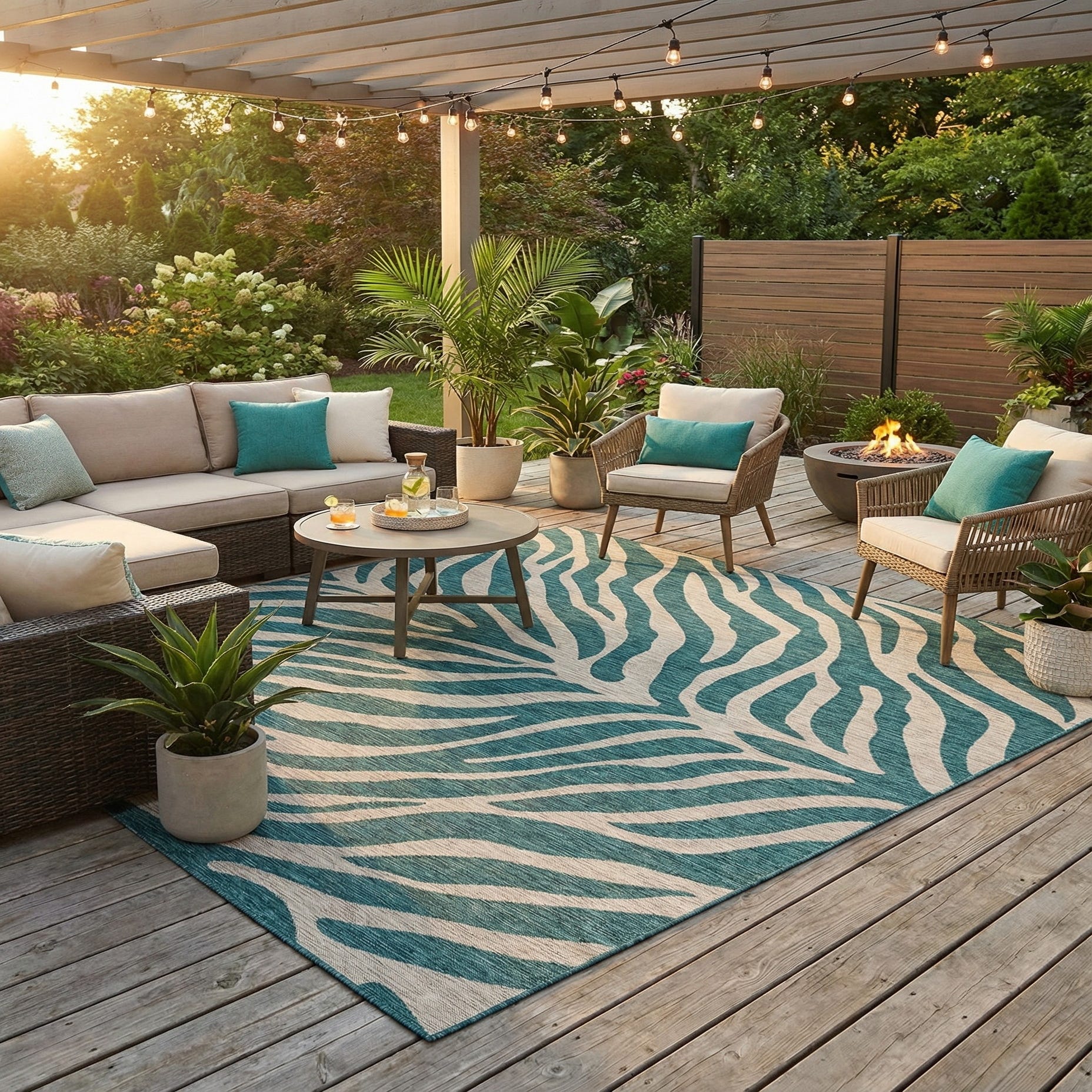 A 10x10 square indoor/outdoor rug featuring a modern zebra stripe pattern in teal blue and beige.