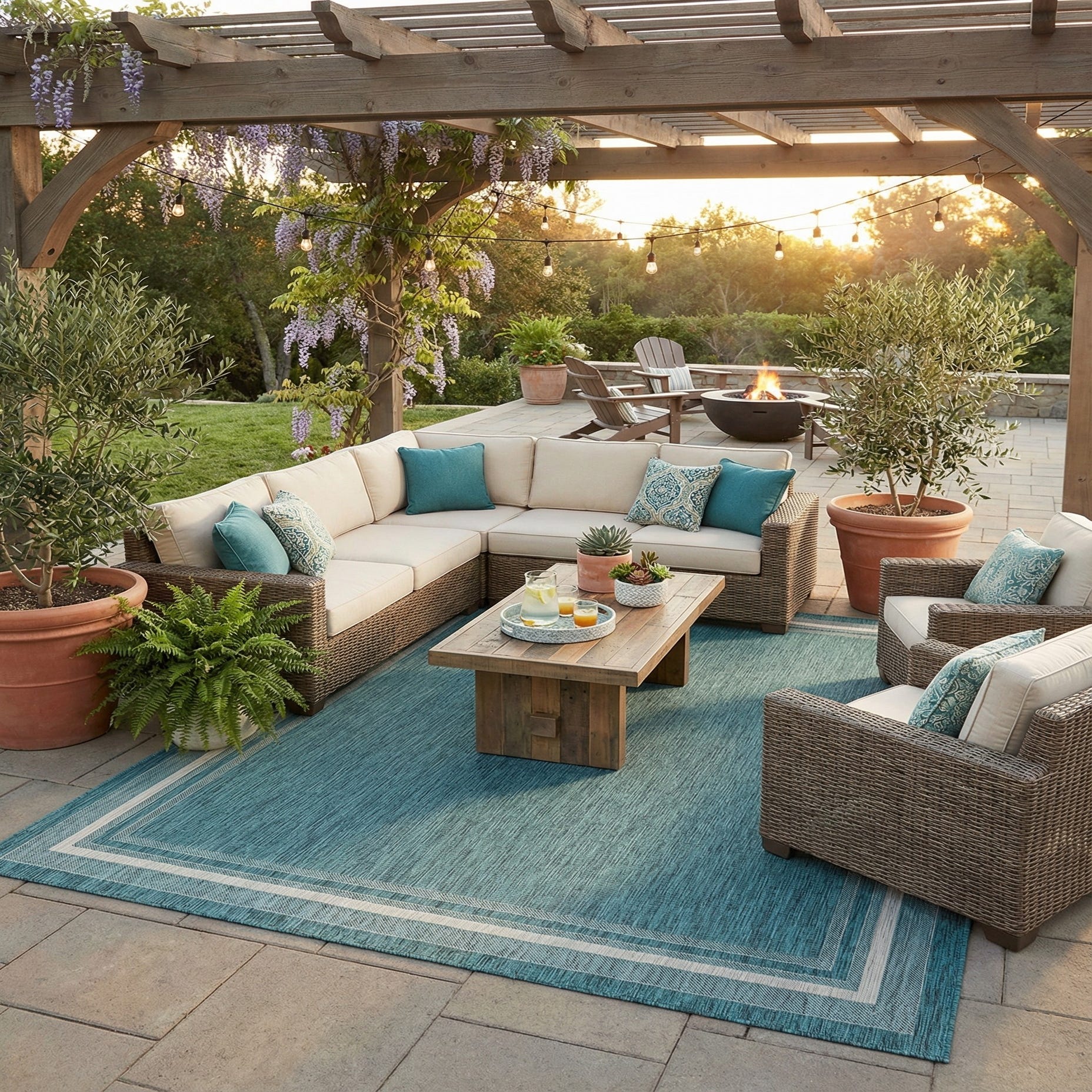 A 10x13 rectangular blue and green outdoor rug with a modern border design, suitable for a patio or living room.