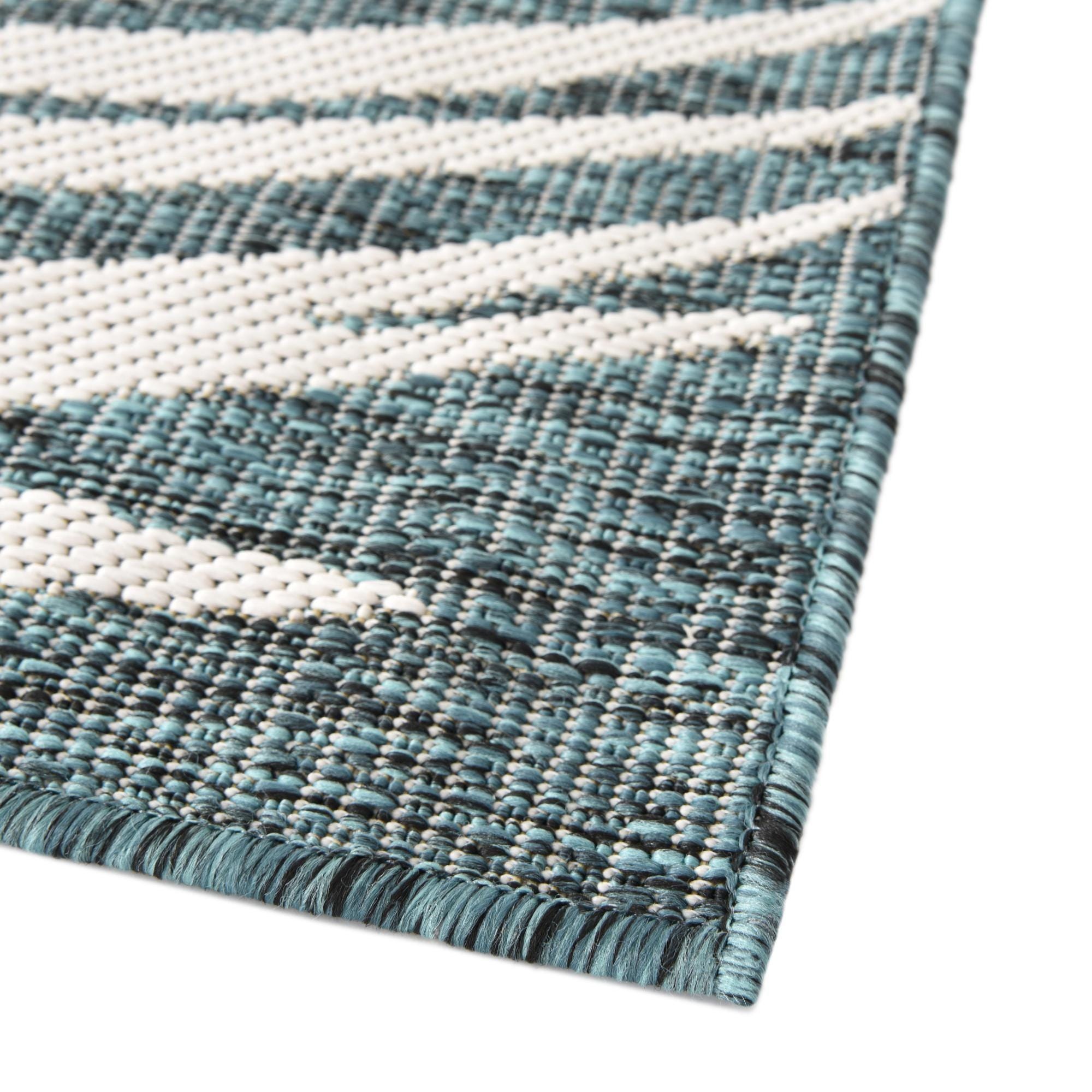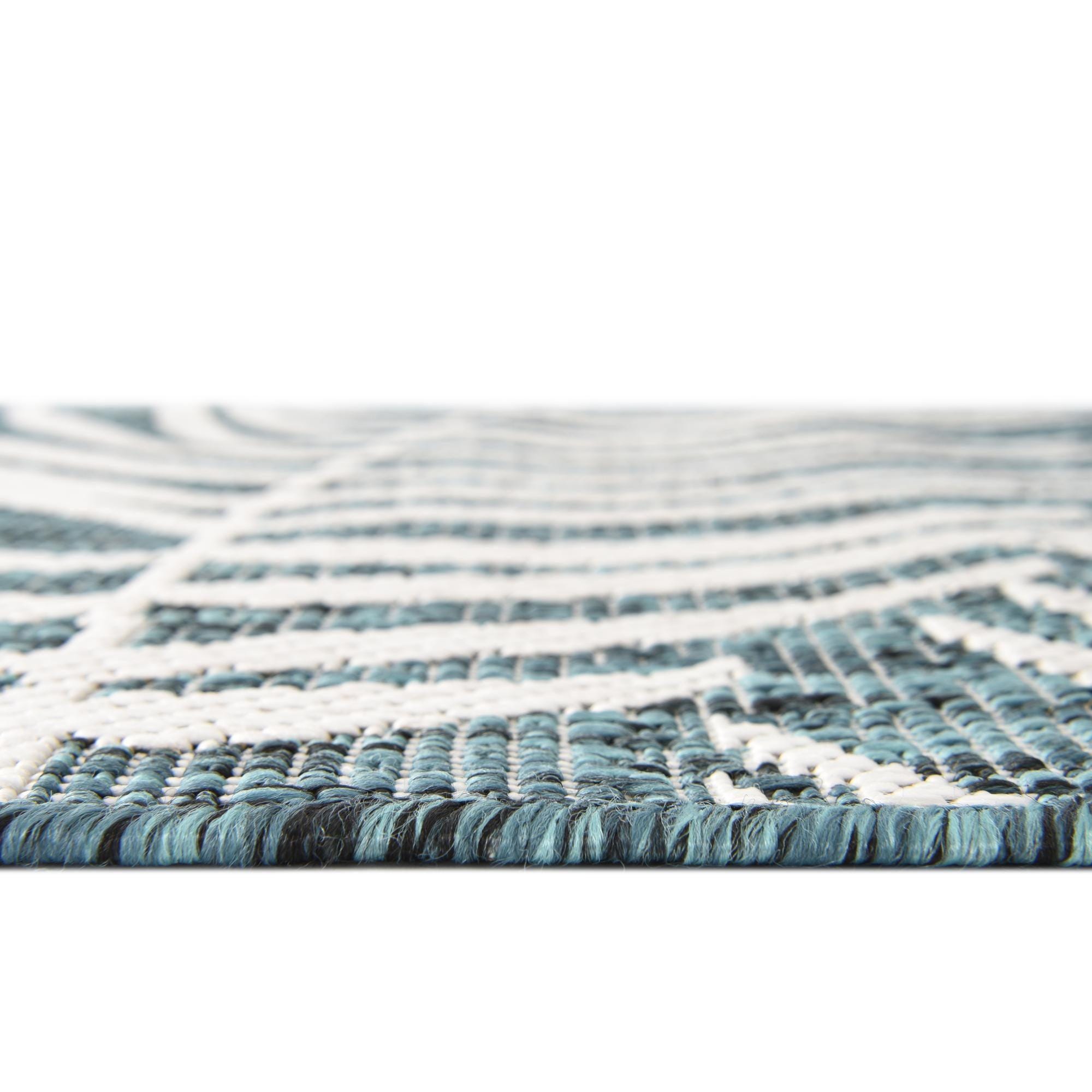 Underfoot the rug feels firm with a slight texture from the weave, offering a stable foundation for dining or conversation areas. Place it beneath an outdoor dining set or on a covered patio to bring color and pattern to your entertaining space, or use it in a sunroom or breezy living area alongside rattan furniture, teak accents, linen cushions, and ivory or navy textiles for a relaxed coastal or modern tropical feel.