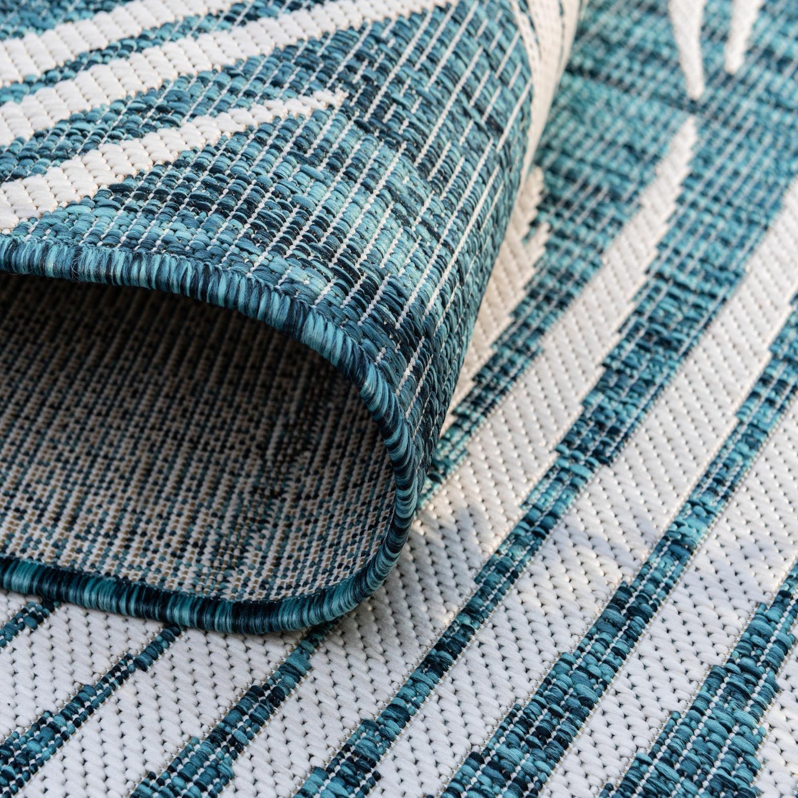 Large ivory palm fronds sweep across a textured teal ground in a bold, modern botanical pattern. The crisp leaf silhouettes create movement and contrast against the deep teal background, giving the rug a fresh, contemporary look that suits both outdoor and casual indoor settings. Machine made from 100% polypropylene, the construction produces a flat, low-profile surface with a subtle woven grain that reads clean and tailored.