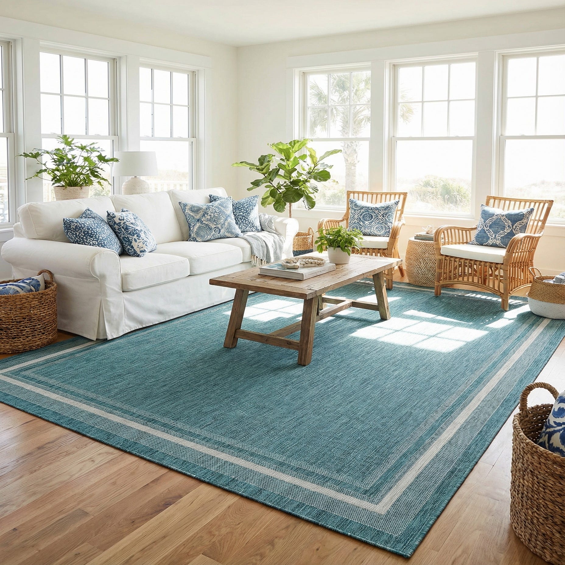 This rug works well in covered outdoor rooms, sunrooms, or casual indoor living spaces where a calm, coastal-influenced palette is desired. Use it to anchor a seating group on a covered patio, define an outdoor dining area, or ground a living room with teak, wicker, or light-wood furnishings. Pair it with ivory cushions, gray metal accents, and woven textures for a relaxed, cohesive look.