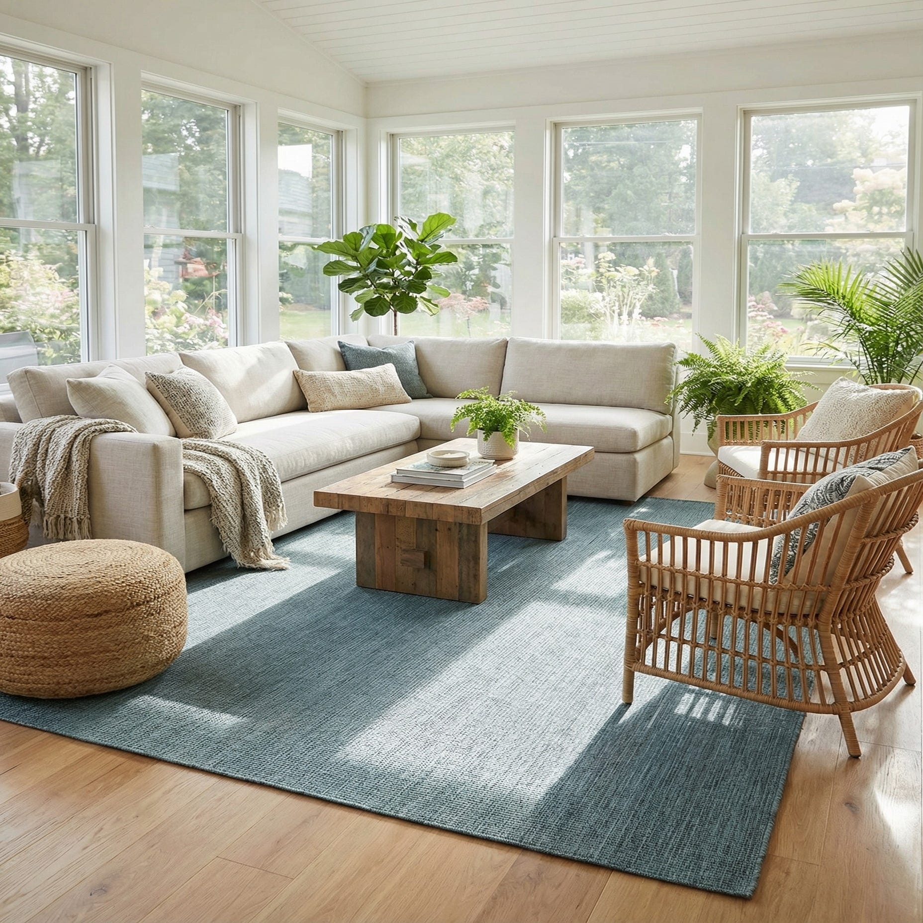 The rug's subtle texture and solid color scheme make it a versatile piece, capable of complementing a wide range of decor styles. It's well-suited for contemporary spaces that embrace bold colors, as well as coastal themes where the teal shade echoes the hues of the sea. This rug will anchor outdoor furniture, creating a cohesive and inviting exterior living area.