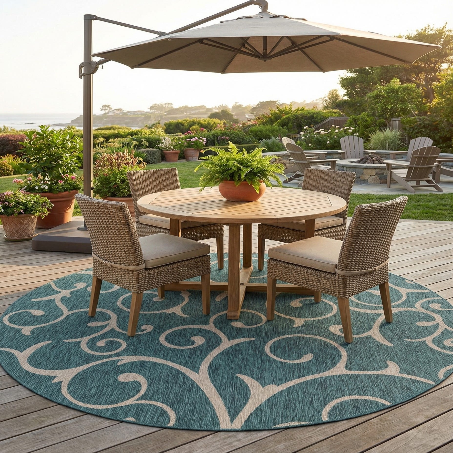 A 10' 8 round blue and green outdoor rug with an elegant cream botanical scroll pattern.