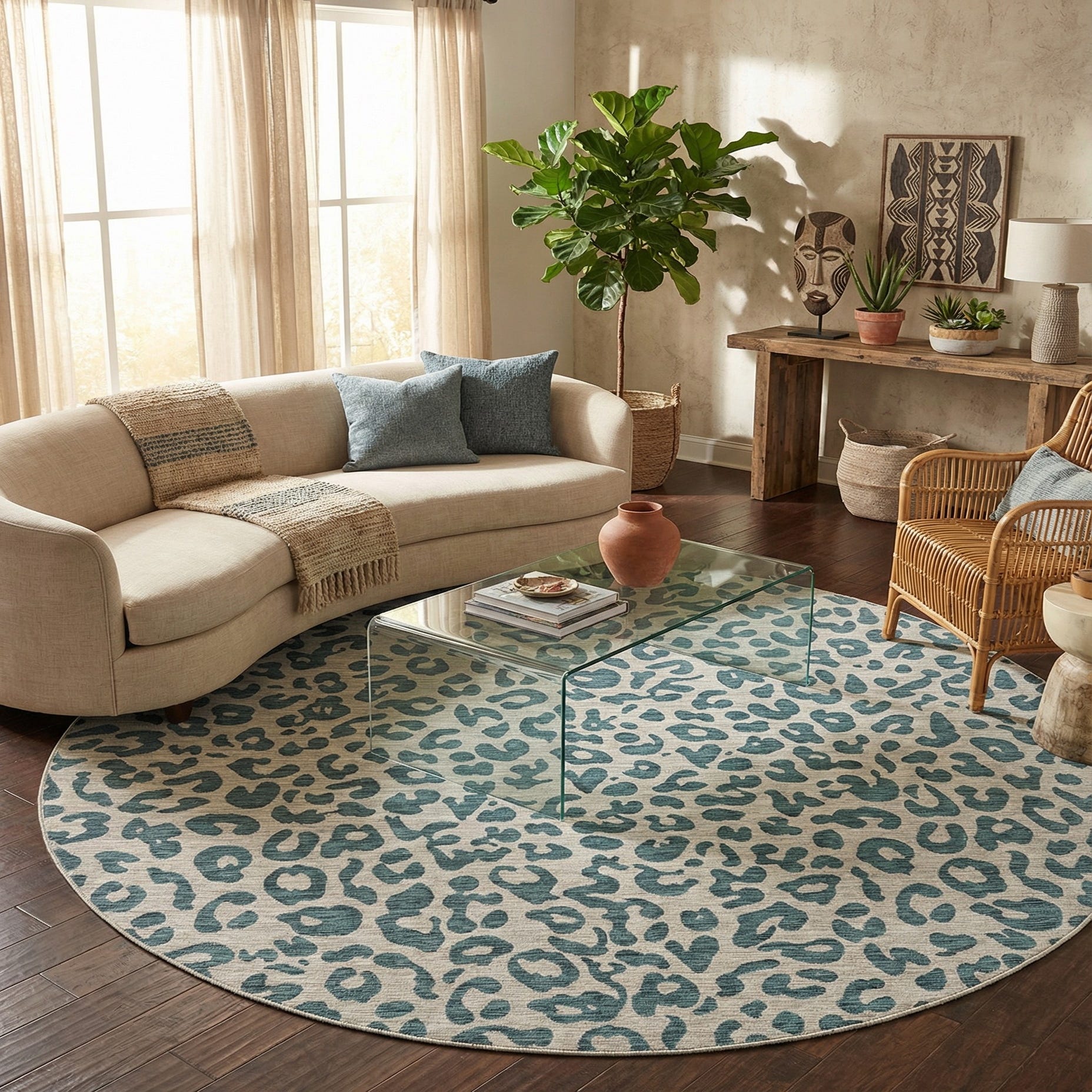 A large round indoor/outdoor rug featuring a modern teal blue leopard print pattern on a light beige background.