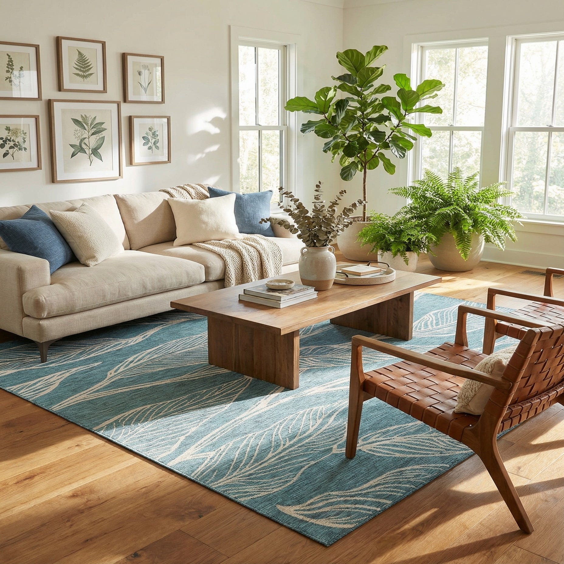 In terms of decor scenarios, this rug would enhance environments that lean toward contemporary, coastal, or tropical design themes, bringing a lively touch to these spaces while offering practical benefits.