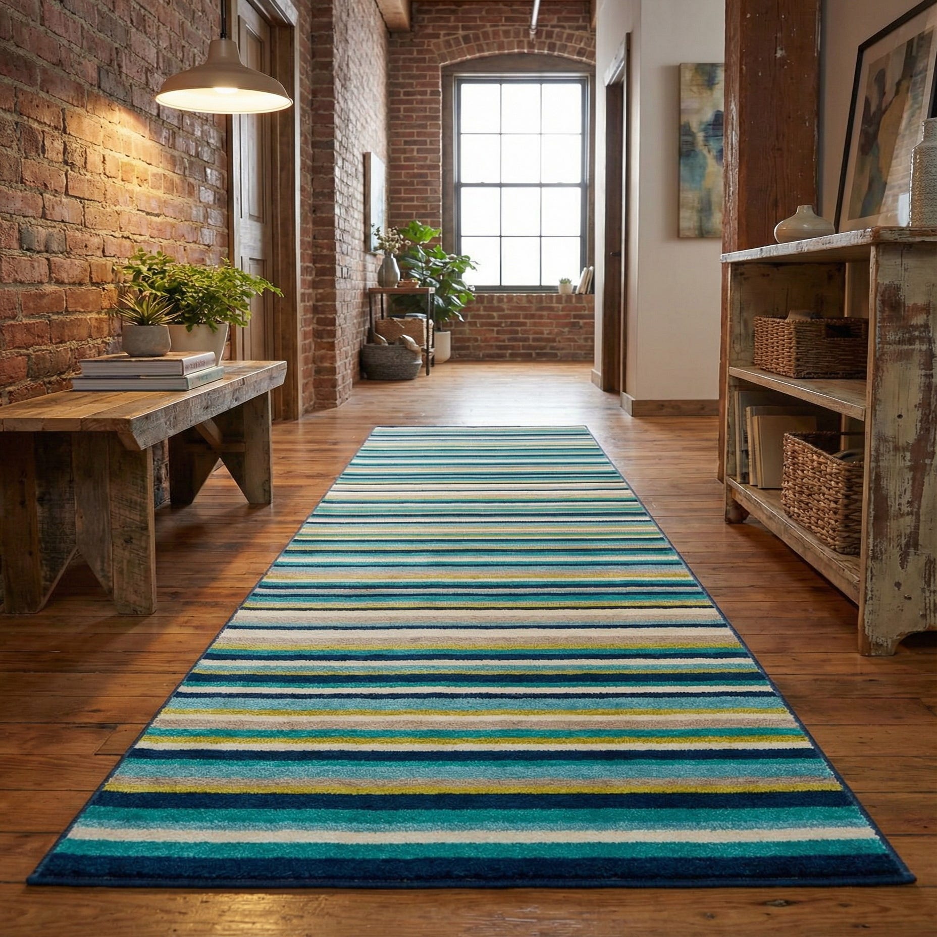 Place this runner down a hallway, in an entryway, or along the side of a bed to bring color and structure to the space. It pairs well with warm wood floors and crisp white trim for a coastal or contemporary look, or with clean-lined, mid-century furniture to add pattern without overwhelming the room. The durable polypropylene construction makes it well suited to everyday areas where you want both style and easy, long-lasting wear.