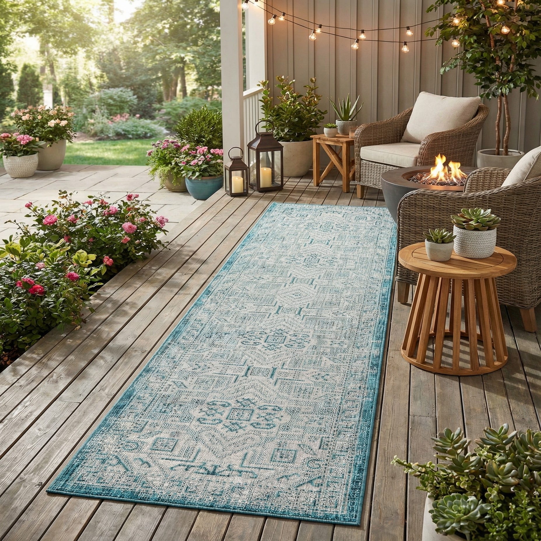 Ideal for adding character to patios, decks, and poolside areas, the Outdoor Aztec runner is equally suited to transitional spaces such as sunrooms or covered porches. Its elegant yet resilient nature also lends itself to indoor use in hallways or entryways that lead to outdoor spaces.