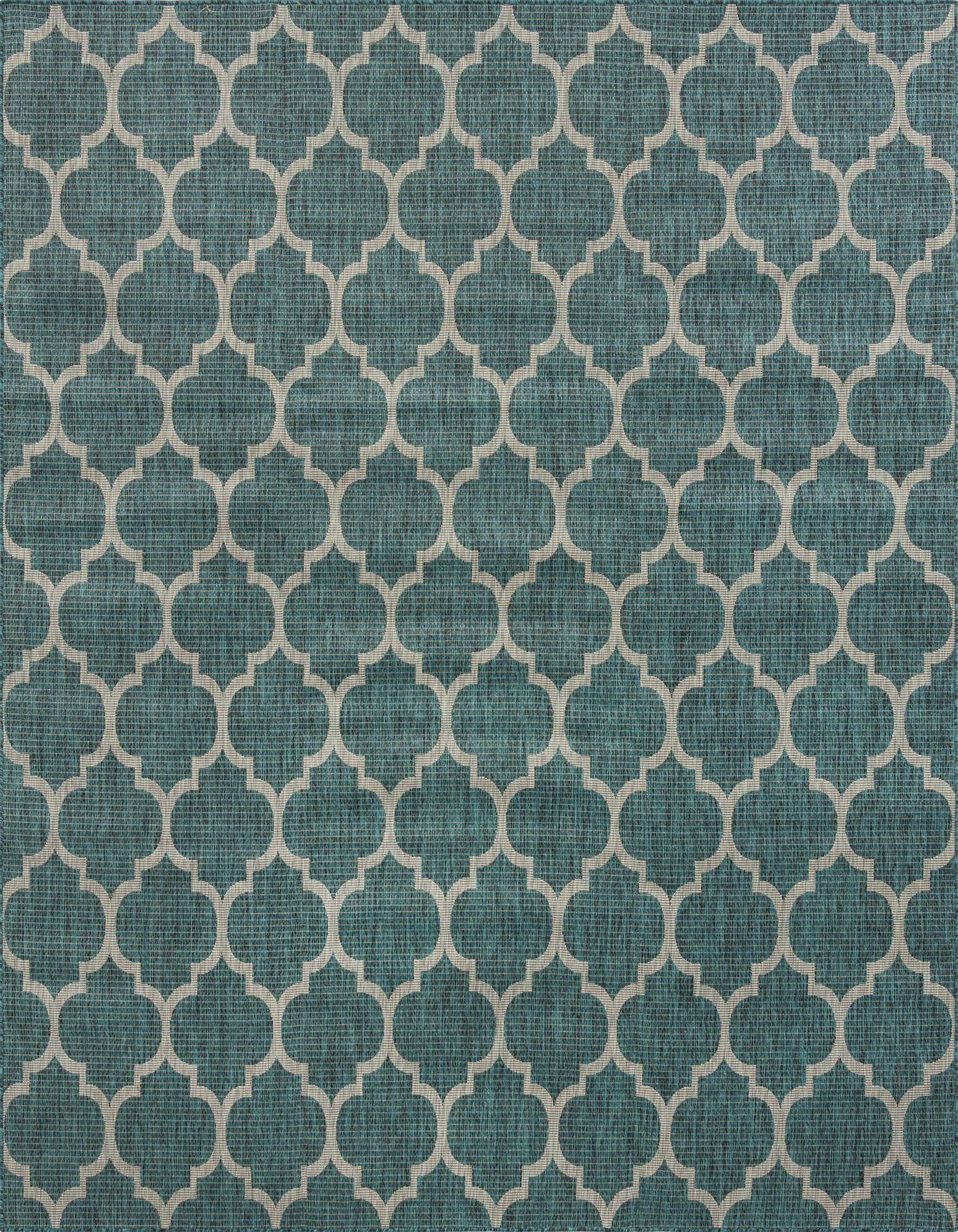Crafted from 100% Polypropylene, the Outdoor Lattice 12 Ft Square rug offers a blend of durability and style suitable for outdoor and indoor spaces alike. The design showcases a lattice pattern that combines teal and grey hues, set against a striking teal background. The pattern adds visual interest without overwhelming, making it a versatile piece for a variety of decor styles.