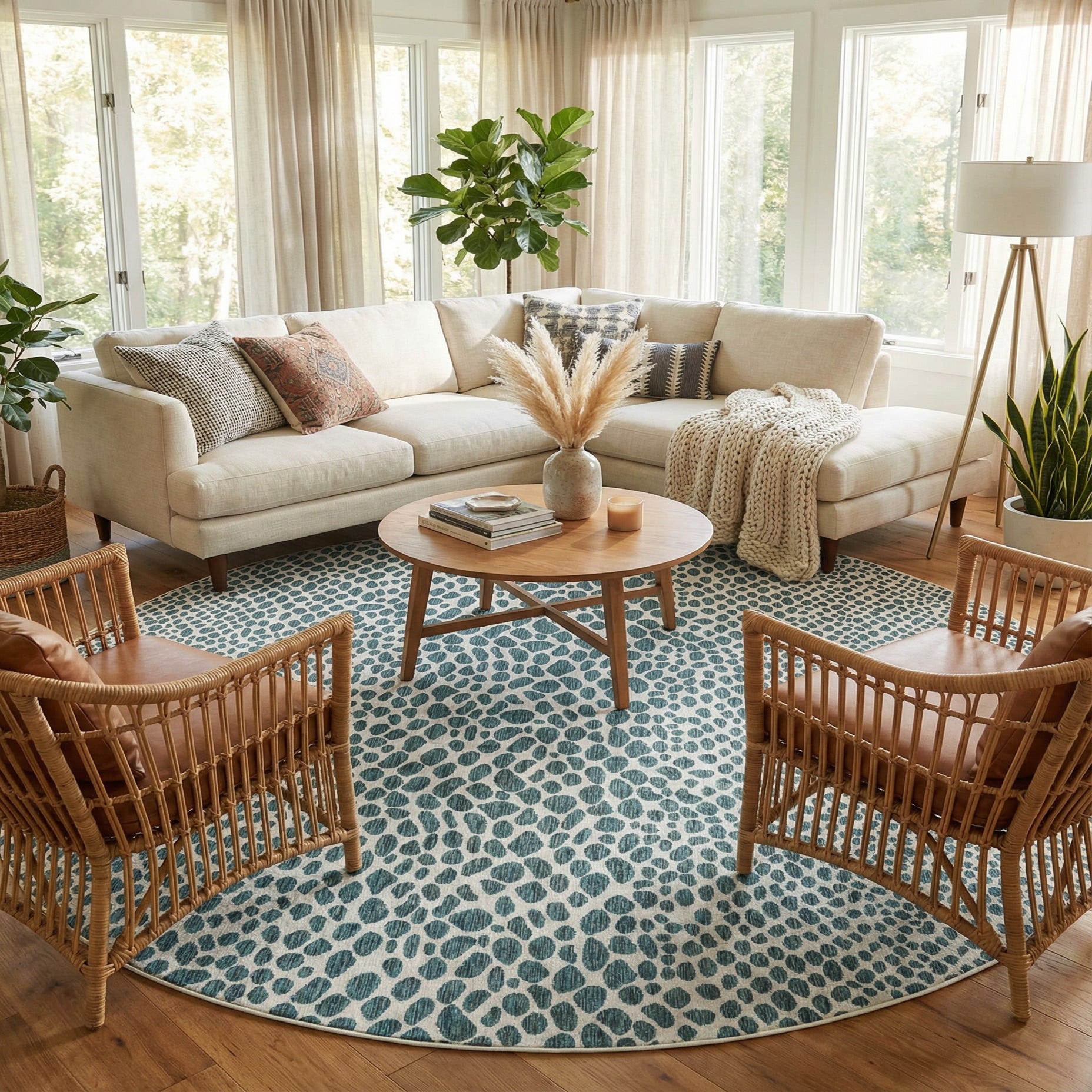 An organic, pebble-inspired pattern of irregular ivory shapes floats across a deep teal field, creating a rhythmic, contemporary look that’s easy to layer into many settings. Machine-made from 100% polypropylene, the construction yields a low-profile, tightly woven surface with a lightly textured hand that feels smooth underfoot while showing subtle horizontal striations in the teal that add visual depth. The round shape reinforces the pattern’s softness and helps define seating or dining areas without adding bulk.
