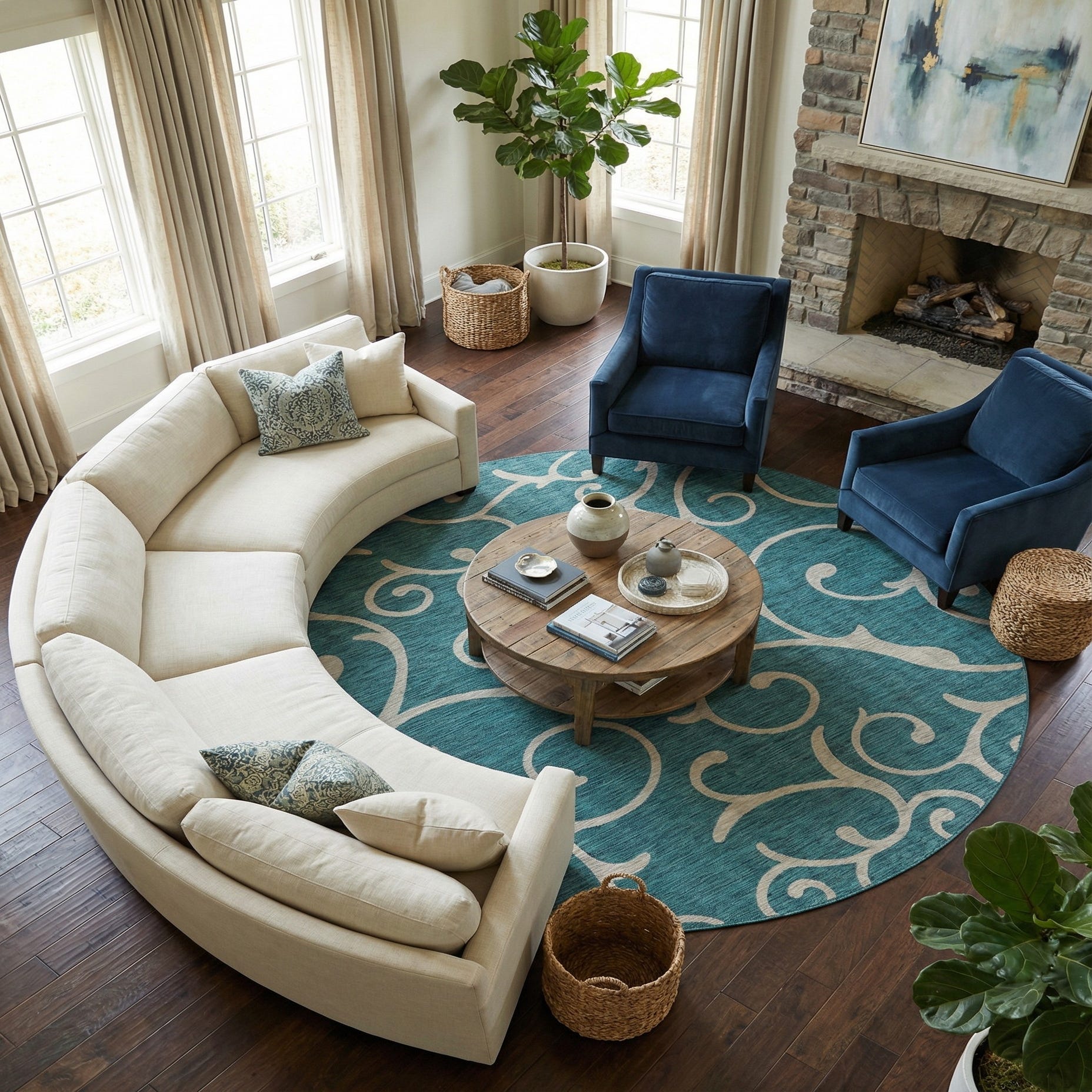This round rug fits easily into covered outdoor rooms, sunrooms, or casual dining and living spaces, where the teal backdrop brings a fresh pop of color without overwhelming the room. Pair it with light wood or gray-toned furniture, ivory linens, and woven or wicker accents for a coastal or modern-transitional look, or use it as a grounding element beneath a round dining table or a conversation grouping in an eclectic or bohemian setting.